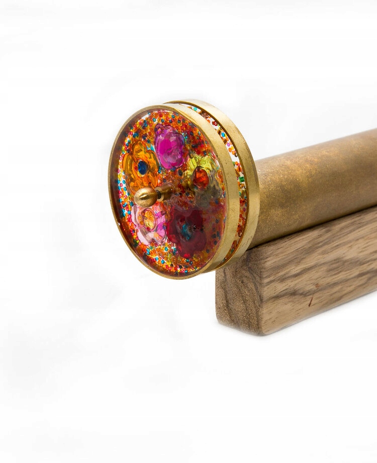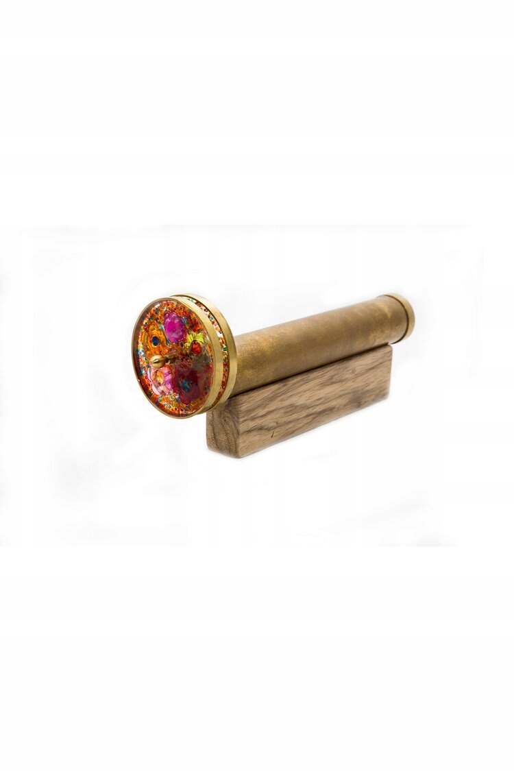 Калейдоскоп середнього ручної роботи з дисками, на дерев’яній підставці. Кожен диск має різні форми та барвисті намистини, які вбудовані в смолу, завдяки якому кожен калейдоскоп унікальний. Кожне джерело світла матиме різний вплив на перегляд вражень через прозорість дисків.