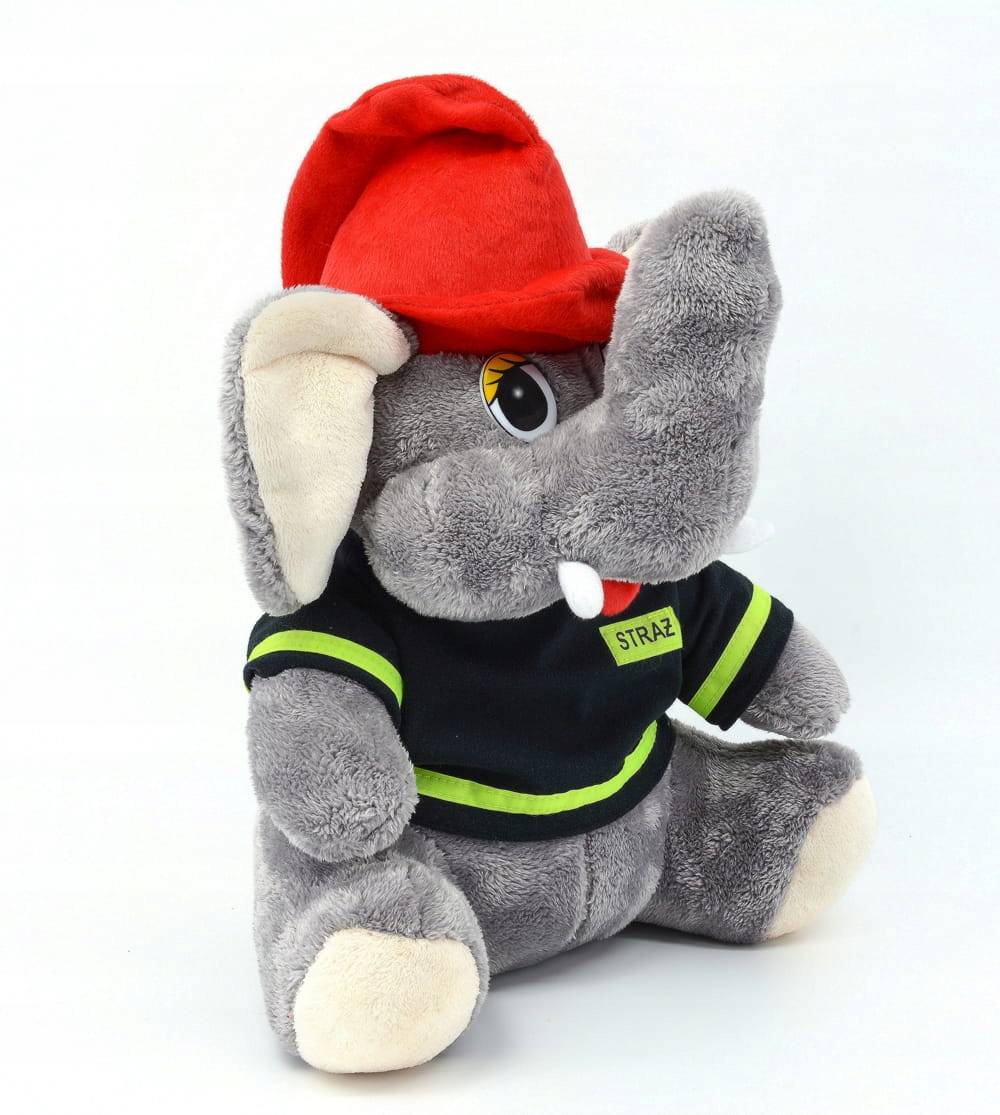 М'який плюшевий слон-пожежний талісман у сидячому положенні. Ідеально для дитини, яка любить пожежну команду, і як подарунок, який неодмінно викличе посмішку на обличчі дорослого. Чудова ідея для талісмана для вашого підрозділу!