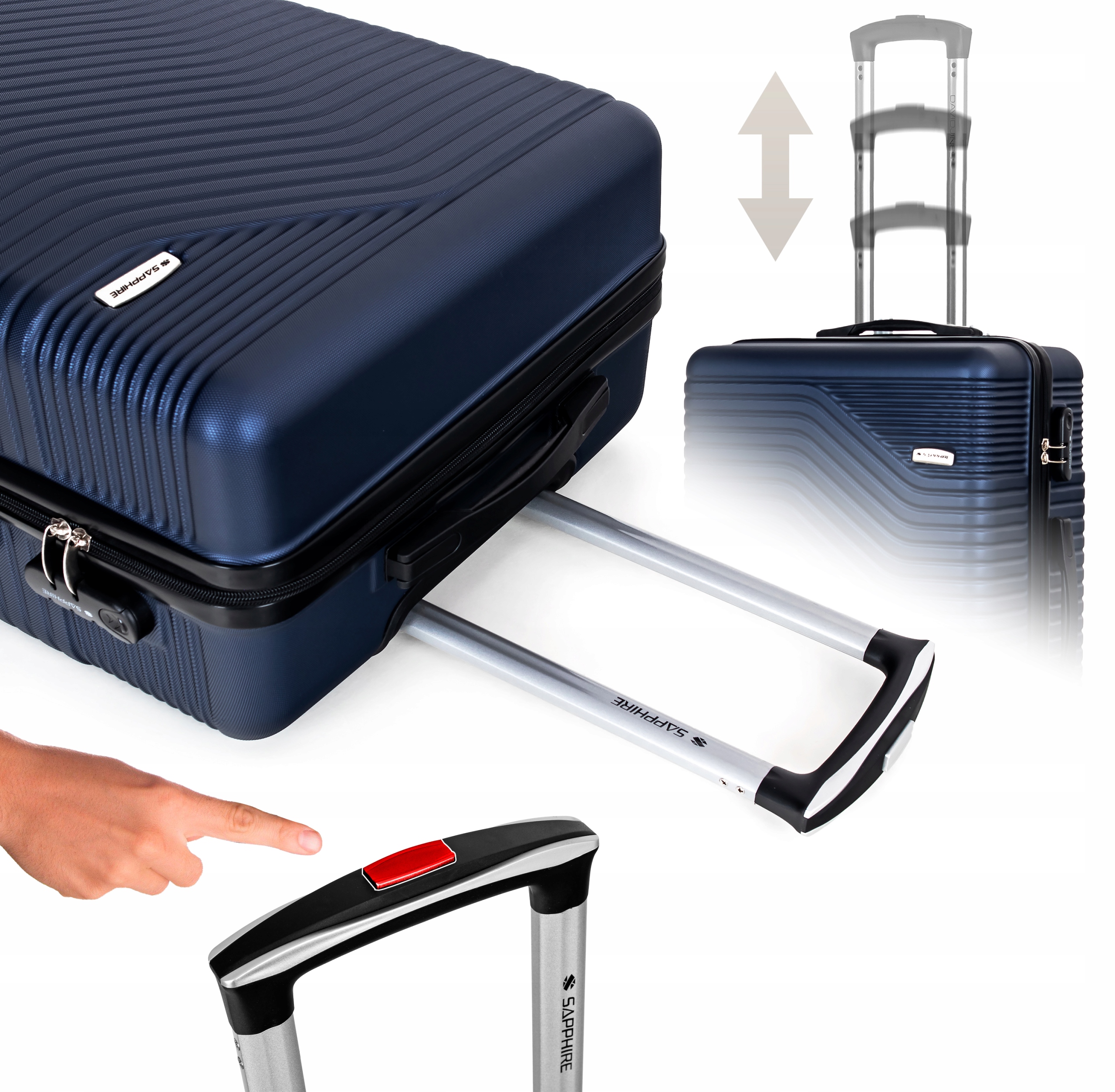 - Алюмінієва телескопічна ручка з можливістю фіксації дозволяєлегко та комфортно переносити валізу. У валізах Sapphire ви можете відрегулювати висоту ручки відповідно до свого зросту.