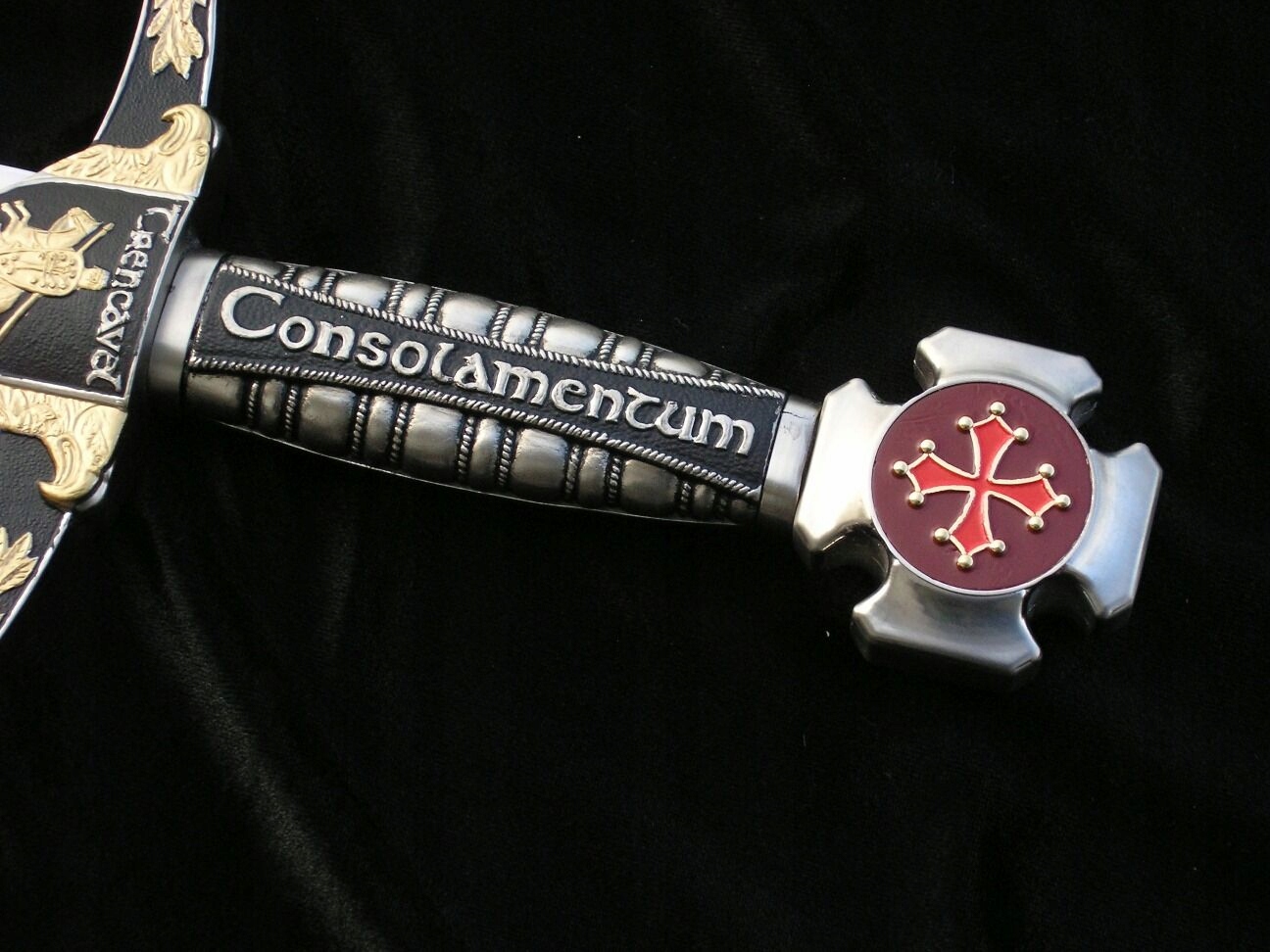 Рукоятка: метал із багатим гравіюванням - напис Consolamentum - катарський ритуал має сакраментальний характер, забезпечує прощення гріхів і символізує прийняття вірних до групи Досконалих.