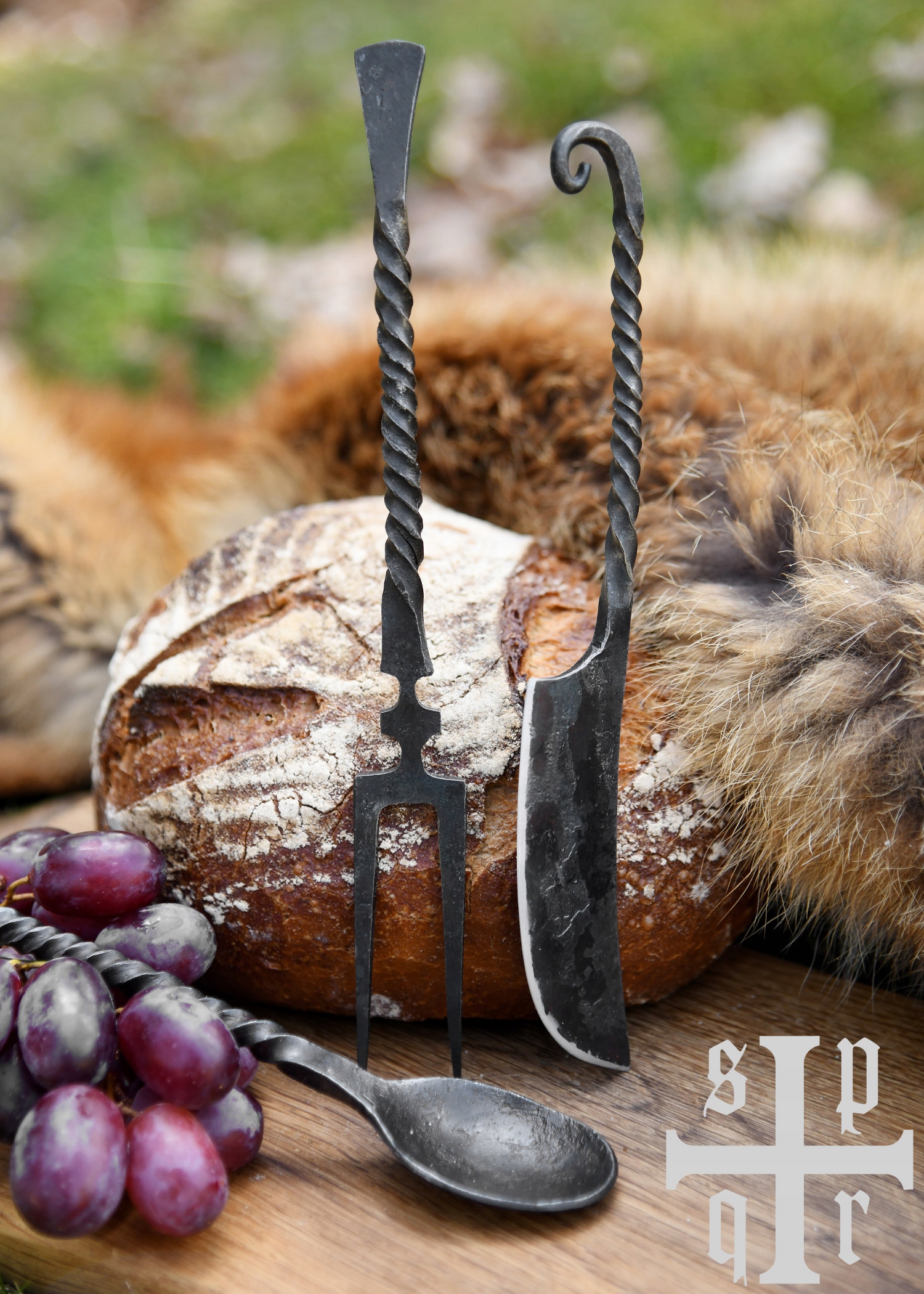 рукописний середньовічний набір мандрівників (3 частини) середньовіччя подібні набори були невід'ємним супутником мандрівників та тренерів. Їх німецьке ім'я - Kutscherbesteck або Fuhrmannbesteck - буквально означає "столові прилади тренерів" і посилається на їх практичне використання на дорозі. 4 Середньовіччя, велика опора для історичних ярмарків, таборів, постановки та ларп. Залізо (не нержавіюча) Нож: Прибл. 21 см, 75 г вилка: прибл. 23 см, 65 г Ложка: Прибл. 21 см, 75, 75 г
