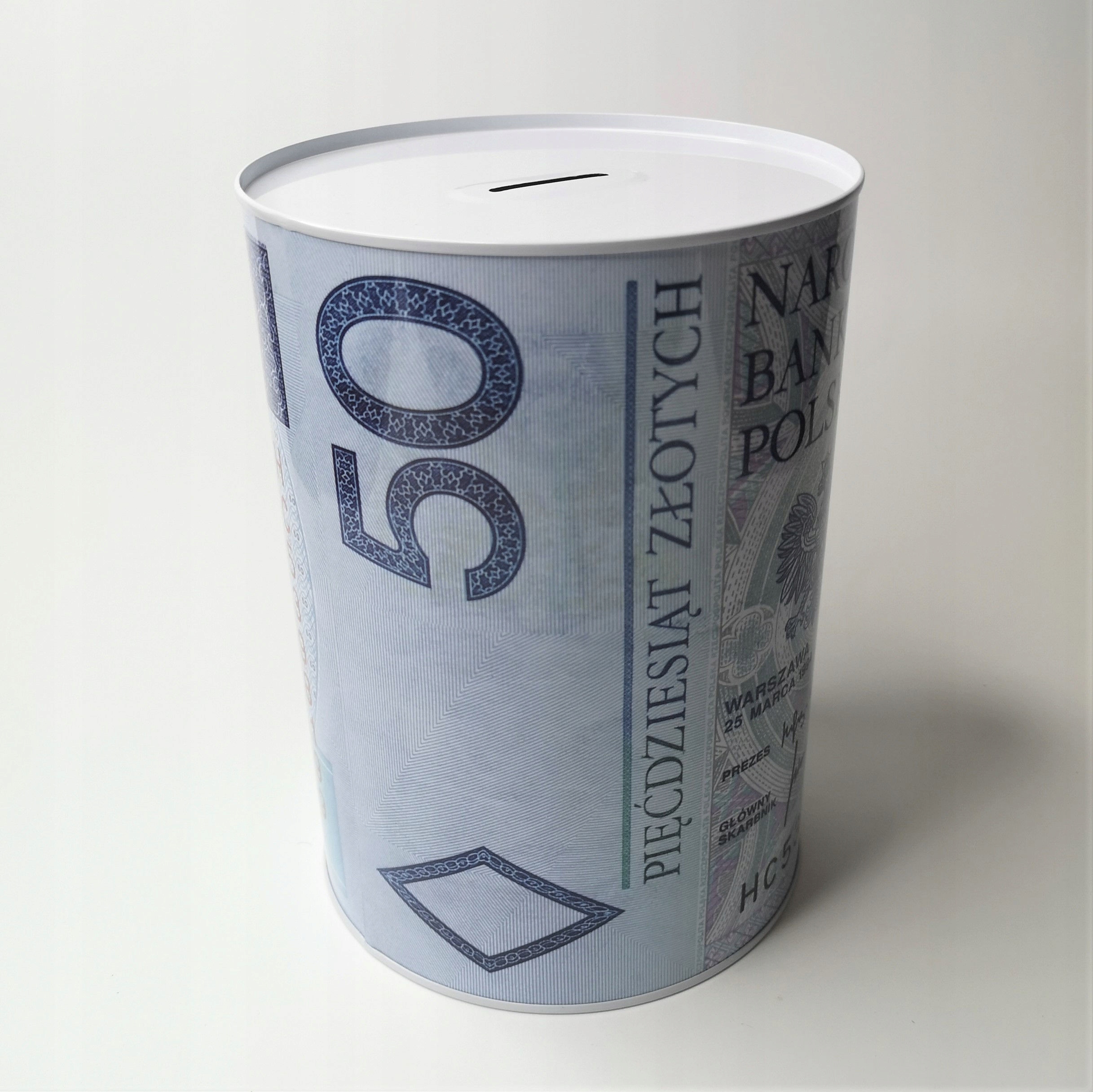 Металева скарбничка середнього розміру 50 злотих, номінал грошей