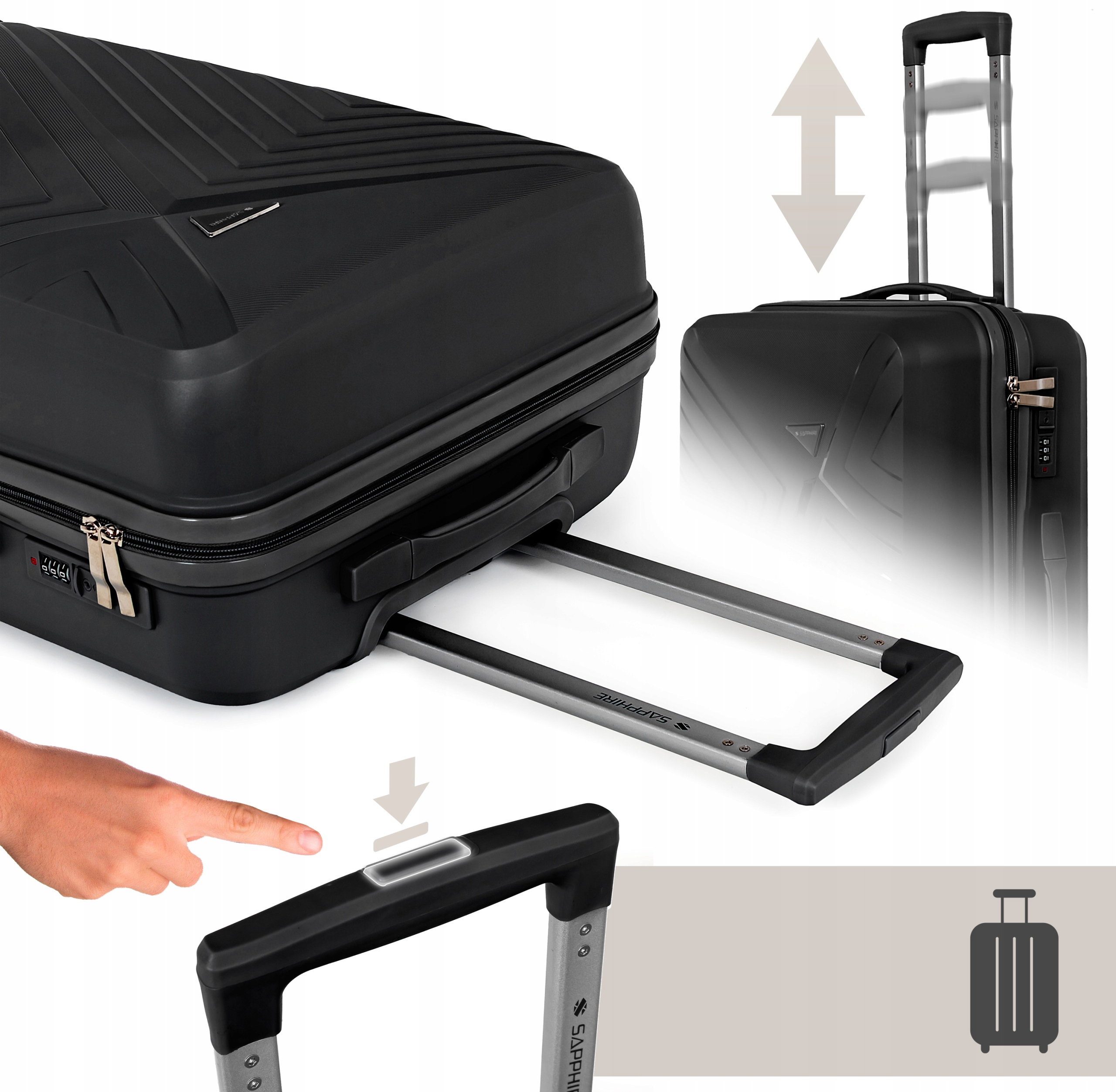 - Алюміній, телескопічна ручка з можливістю блокування ввімкнення легкої та зручної обробки валізи. У валізах сапфіру ви маєте можливість регулювати висоту висоти.