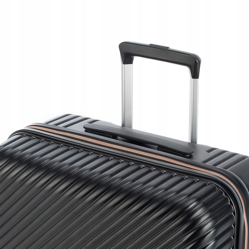 Середня валіза WITTCHEN 56-3P-842-10з колекції GL Style чорного кольору, з полікарбонату з матовим покриттям. Валіза оснащена чотирма подвійними колесами, виготовленими з матеріалу ABS і покритими термопластичним покриттям, алюмінієвою, телескопічною ручкою з замком і 2 гумовими, гнучкими ручками. Всередині є відділення з регульованими ременями для запобігання зміщення багажу, відділення на блискавці і 3 кишені на блискавці, включаючи 2 сітчасті кишені. Безпека у вигляді замка TSA є додатковою перевагою. Завдяки цьому під час митного огляду багажу ми можемо гарантувати неінвазивне відкриття валізи та її повторне закриття, не пошкодивши замок. Валіза легка, але містка і практична.