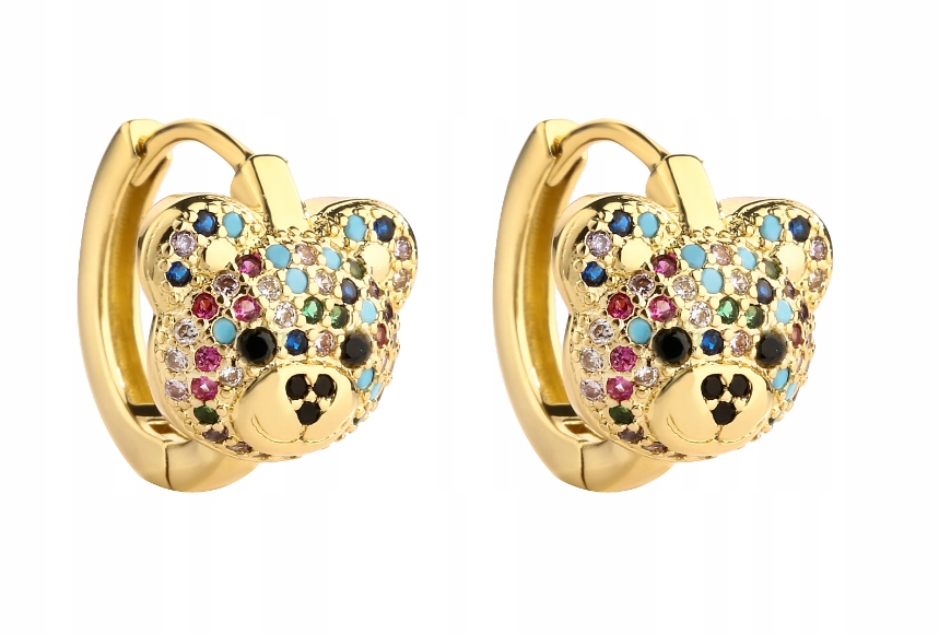 Сережки дитячі ведмедики, золоті різнокольорові циркони, кружечки