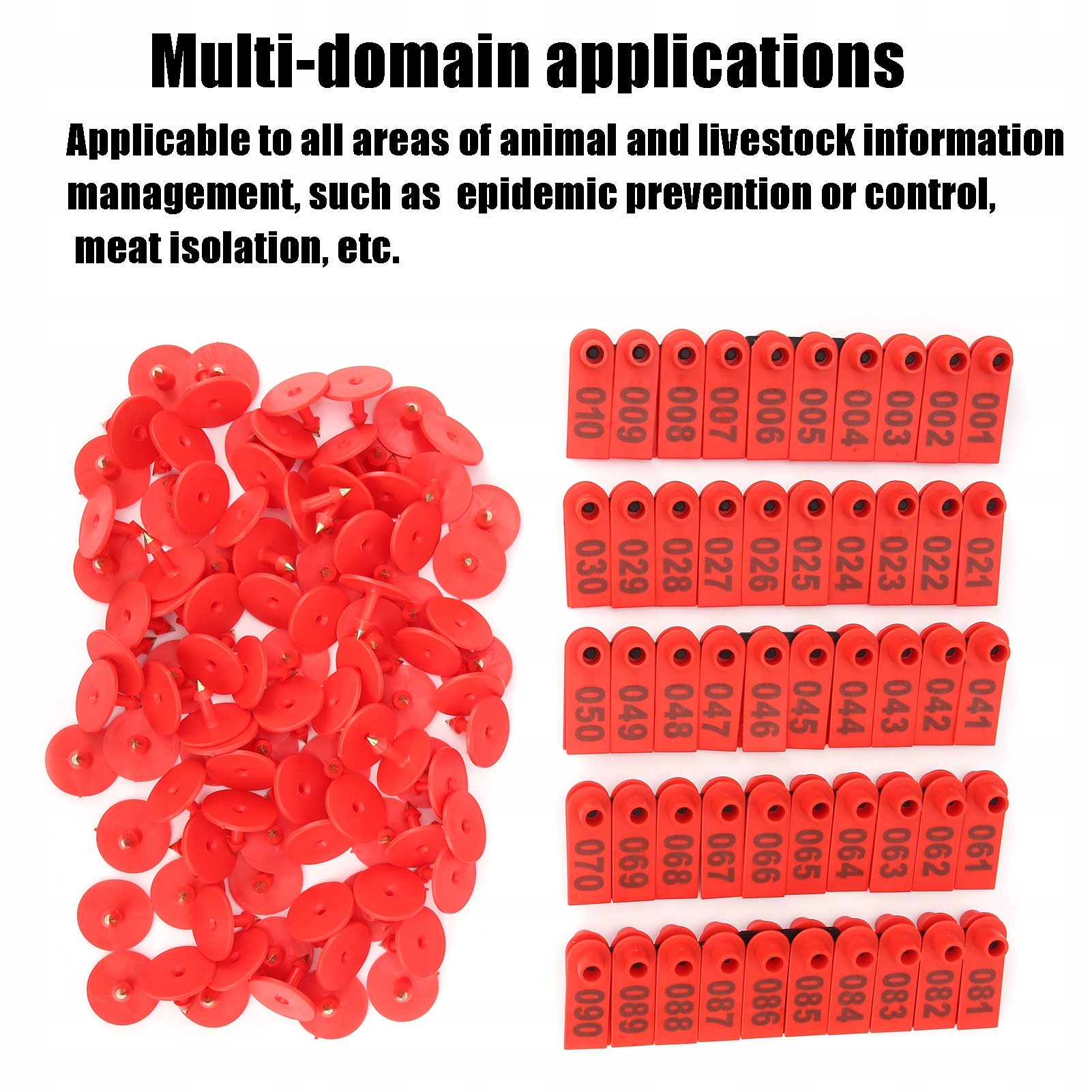 1. Пластик м’який, неплачений і нетоксичний, що не впливає на здоров'я тварин. Цифри чіткі, вони не в’януть і легко ідентифікувати сільськогосподарських тварин на вухах. Сережка має невелику форму, її нелегко вкусити сільськогосподарські тварини, і її не легко відірвати. Застосовується до всіх областей управління інформацією про тварин та сільськогосподарських тварин, таких як запобігання епідемікам або контролю, м'ясна ізоляція тощо