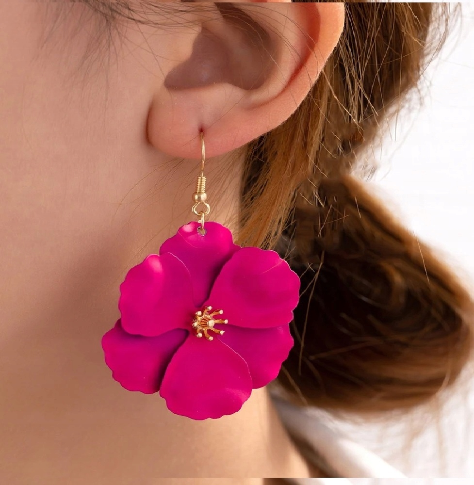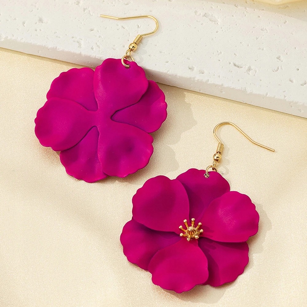 Сережки Металічні квіти, що висять троянди пелюстки 3d фуксія