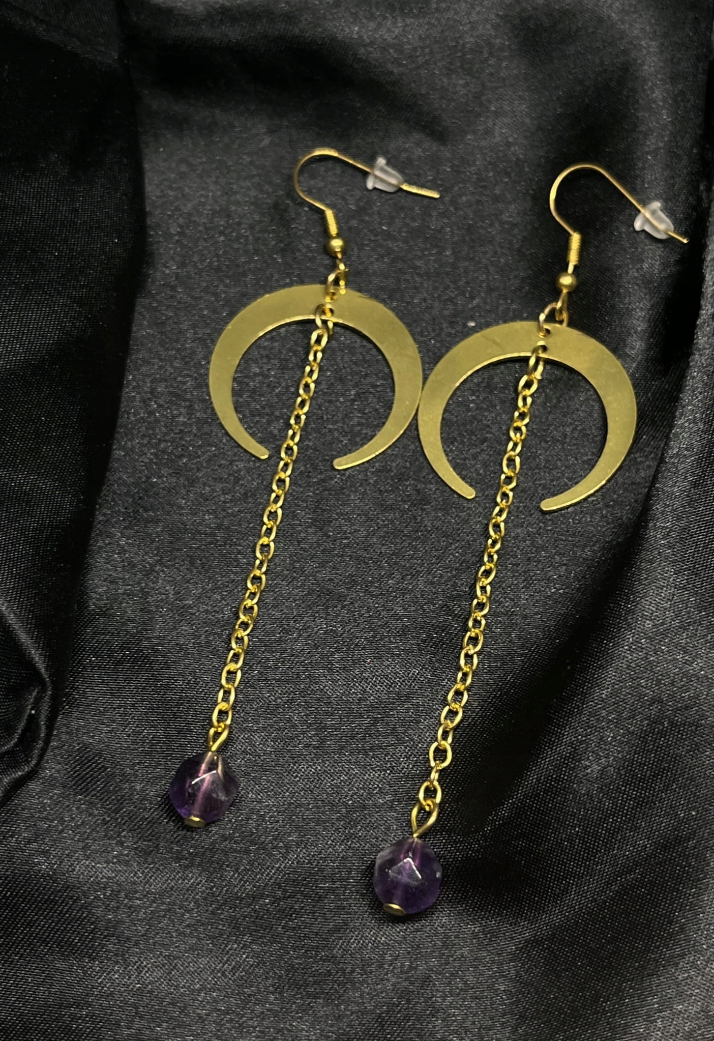 Носіння цих сережок є не лише вираженням елегантності, але й несе з собою енергетичну мудрість аметисту, підкреслюючи витонченість місячної форми та золоте сяйво, вносячи нотку езотеричної гармонії в повсякденне життя.