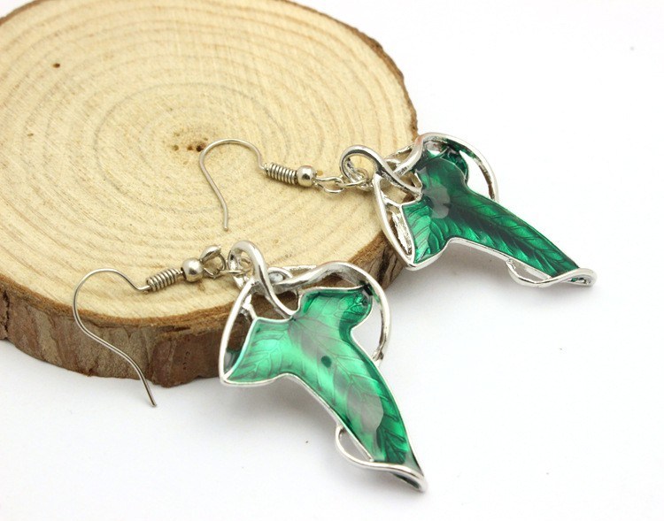 Сережки за зразком брошки «Листок Лорієну», яку носило Братство Персня, виготовлені зі срібного металу із зеленою емаллю, довжина приблизно 4 см, ширина приблизно 2,5 см, гачки відкриті.