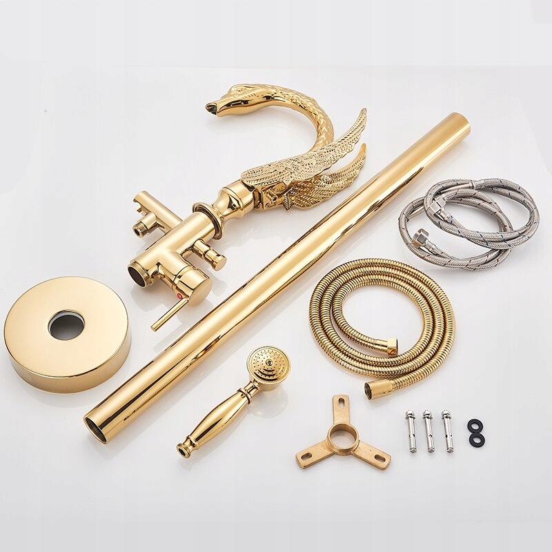 Розкішний золотий набір - справжній витвір мистецтва у світі меблів для ванних кімнат. Гарнітур для ванної виготовлений з матеріалів найвищої якості, що робить його міцним і унікальним на вигляд. Золоте покриття надає змішувачам елегантний, розкішний вигляд, а форма лебедя додає неповторний стиль. Такі змішувачі неодмінно привернуть увагу та стануть окрасою будь-якої ванної кімнати.