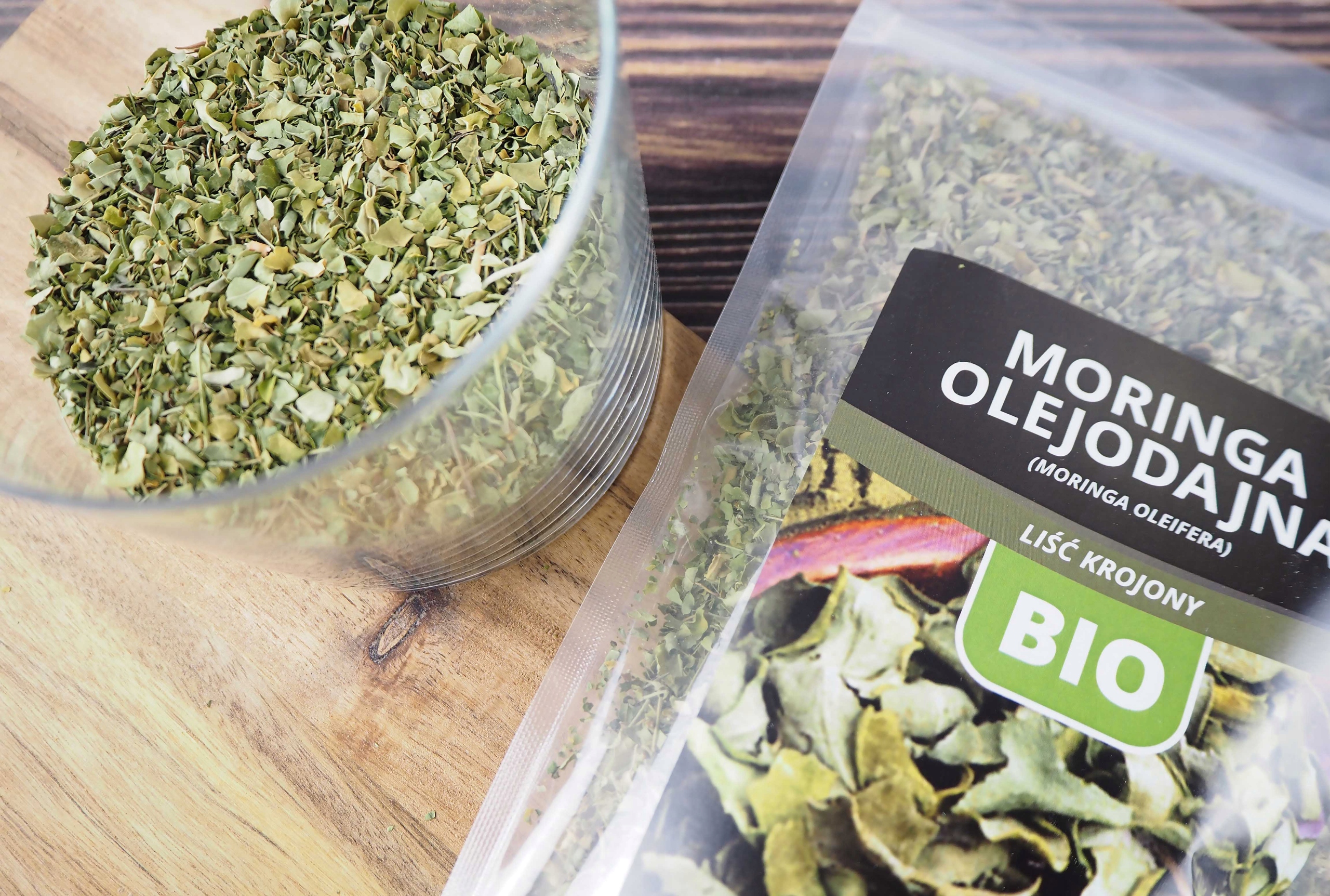 Подрібнене (мелене) листя можна використовувати як добавку до смузі, коктейлів, супів і йогуртів. Вони можуть стати ідеальною заміною крес-салоні та шпинату. Подрібнене листя ідеально підходить для приготування настою, воно добре поєднується з шипшиною або бузиною. Настій має злегка солодкуватий і приємний присмак. Дослідження, проведені Brunschwick Laboratories, довели, що порошок листя морінги має високу антиоксидантну здатність ORAC (Oxygen Radical Absorbance Capacity), яка значно перевищує потенціал плодів годжі, зеленого чаю або червоного вина. Згідно з літературними даними та веб-сайтом nutraingriedents, листя морінги містить велику кількість заліза (28 мг/100 г), калію (1,3 мг/100 г), кальцію (2 грами/100 грамів сухофруктів) і вітамінів A, D, C, K . Продукти Moringa також можна знайти у формі капсул, таблеток або як доповнення до кремів і мазей. Масло, що міститься в цій рослині, на 70 відсотків складається з олеїнової кислоти, що ставить його в один ряд з оливковою олією.