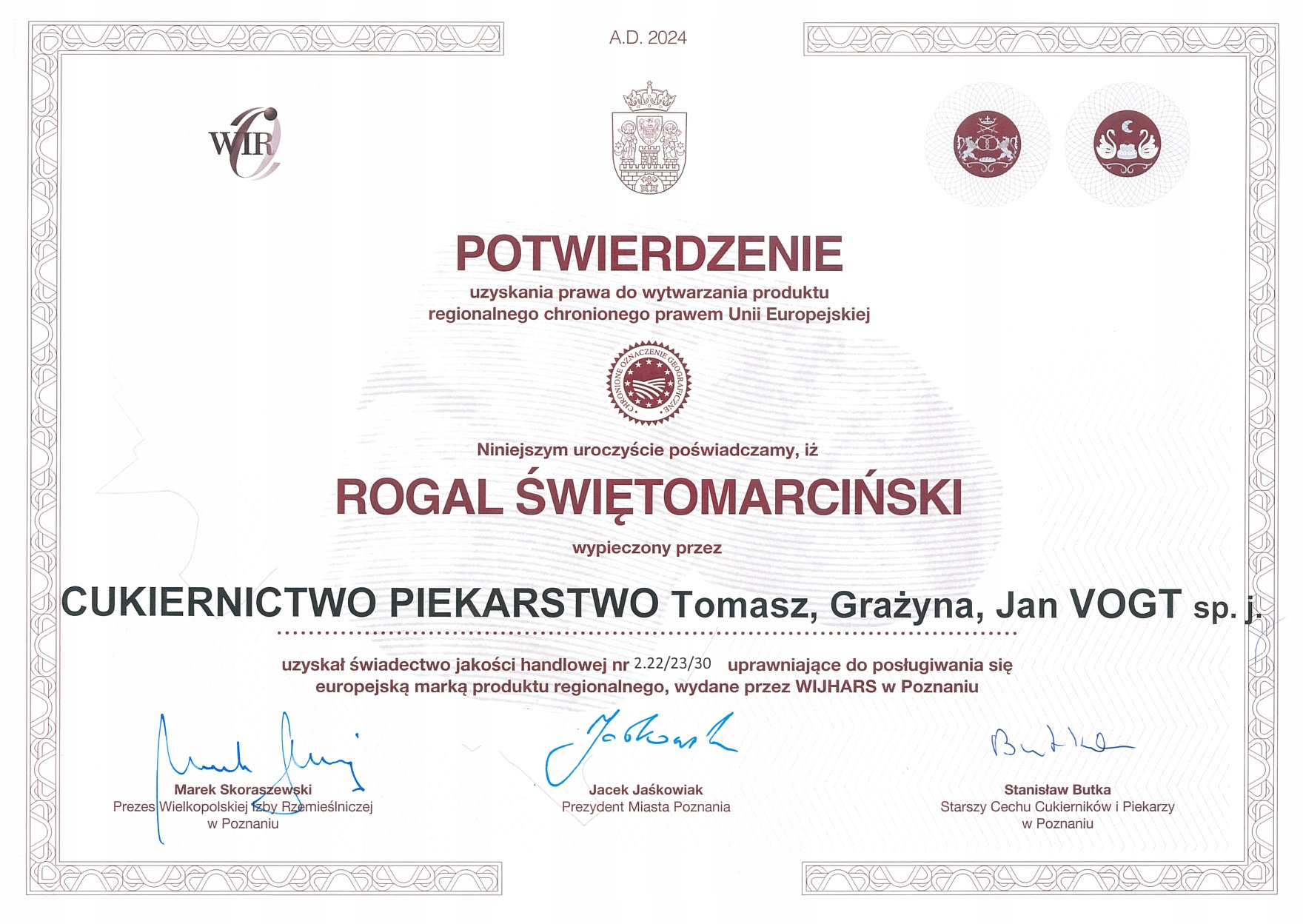 Our croissants are Створений у авторитетній кондитерській фонді в Ковалево, який має сертифікат глави Познань -świętomarciński Rogal. Кожен круасан відповідає стандартам найвищої якості, під наглядом провінційної інспекції комерційної якості сільськогосподарських та харчових виробів. Завдяки цьому, наші круасани мають престижне захищене географічне позначення, що підтверджує їх унікальність та дотримання традиційних рецептів.