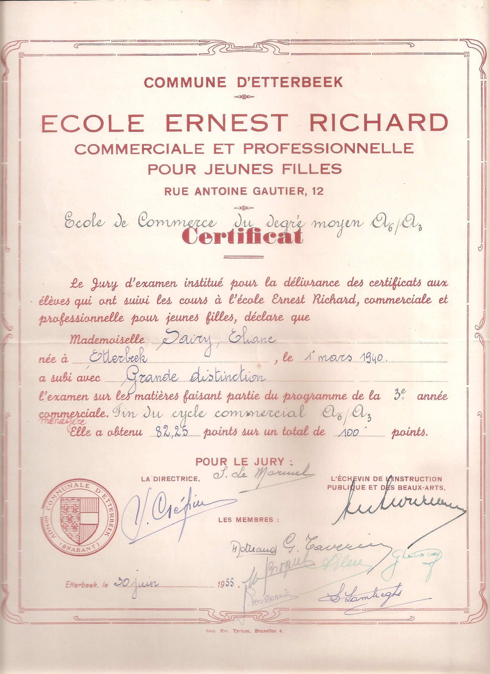 Сертифікат від школи для молодих наречених з Бельгії з 1955 року.