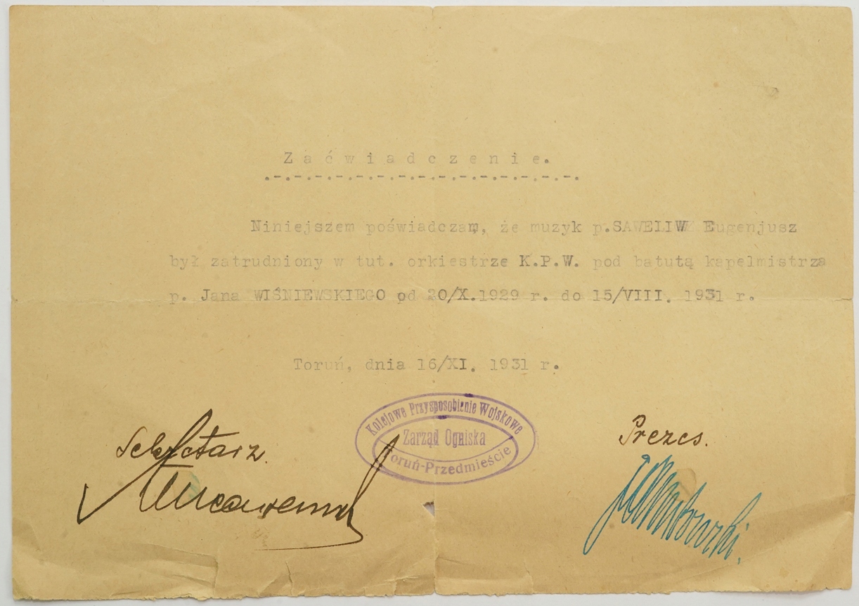 Сертифікат Військового прийняття залізничного оркестру Торюн -Оркестр 1930