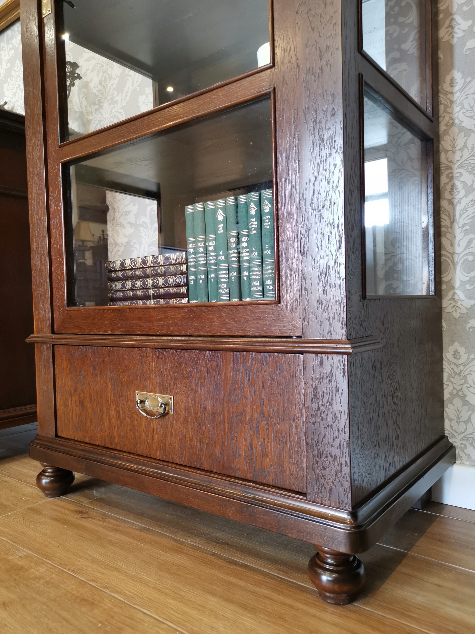 Пропонуємо Вашій увазі шафу в стилі модерн. Меблі облицьовані дубовим шпоном, пофарбовані в коричневий колір і мають напівматове покриття.