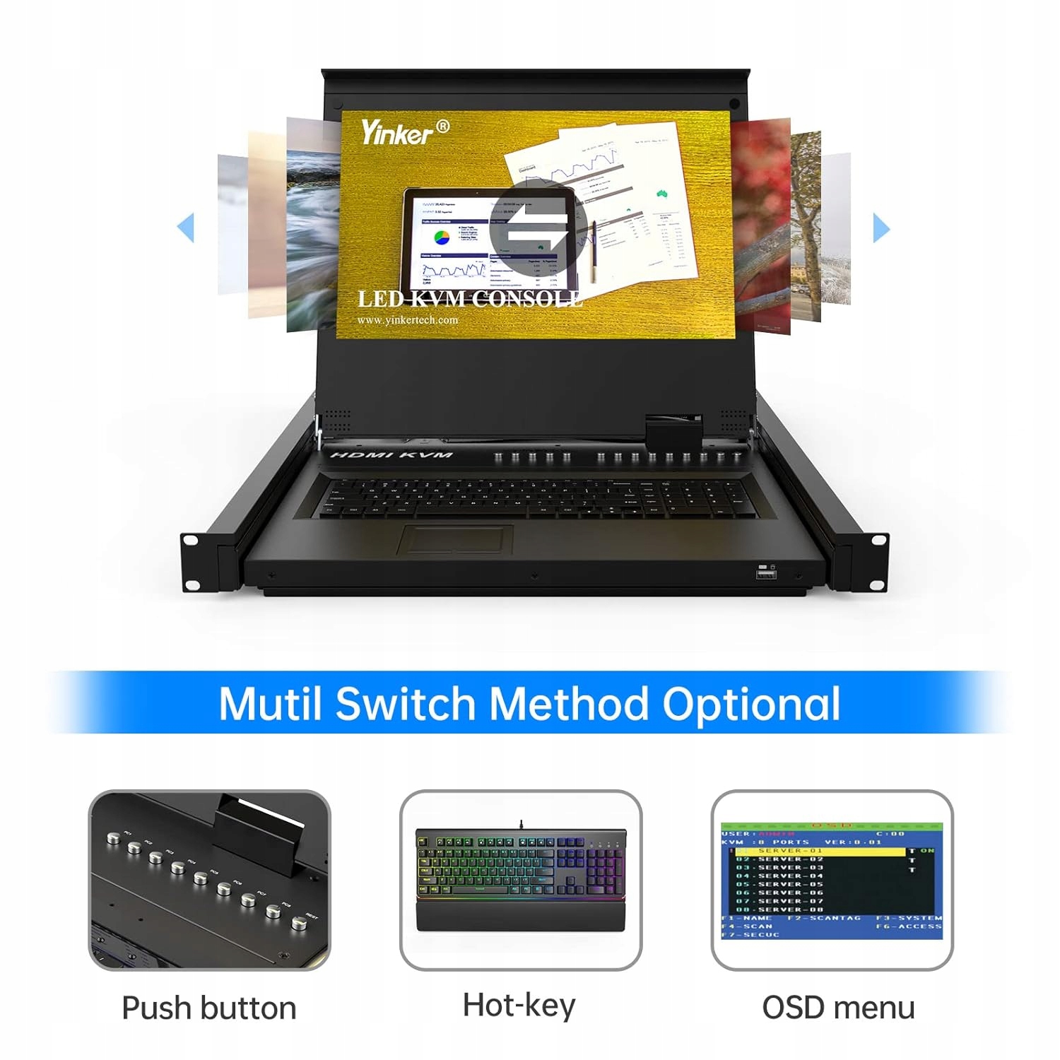 8-портовий перемикач KVM HDMI Yinker для монтажу в стійку з вбудованим 17-дюймовим РК-монітором, клавіатурою та сенсорною панеллю дозволяє вам керувати 8 комп’ютерами або серверами. [ЕМ/Гаряча клавіша/Клавіша панелі] Ця РК-консоль KVM підтримує перемикання через екранне меню, гарячу клавішу та клавішу панелі. Підтримує послідовне/каскадне підключення до 64 комп’ютерів. [Висувна шухляда] Стандартна конструкція стійки 1U та розсувні напрямні дозволяють встановити на бажаній висоті. Якщо полиця більше 60 см, це допоможе подовжити задній ящик. Глибина основи: 60-80 см, глибина заднього ящика: 17,8 см. Продукція іноземного походження підлягає специфіці країни походження, тому продана за кордоном може відрізнятися за певними характеристиками, такими як посадка, вікова класифікація, мова етикетки чи інструкції (можуть бути недоступні польською мовою).