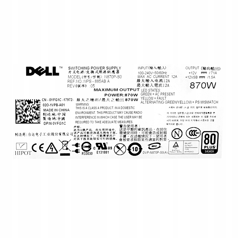 Серверний блок живлення DELL N870P-S0, 0YFG1C, PowerEdge R710, T610