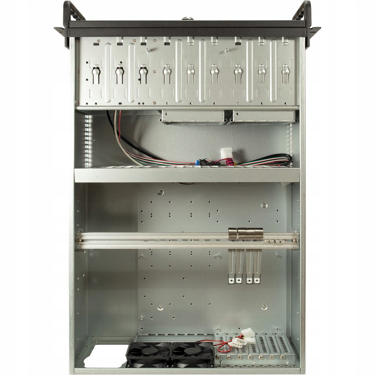 - Дві знімні передні відсіки для дисків із вбудованими вентилятори 120 мм, кожен з місцем для 5 жорстких дисків 3,5", які можна встановити без гвинтів - 3x 5,25"; П'ять додаткових вентиляторів на середній смузі (3x 120 мм) і ззаду (2x 80 мм) також забезпечують оптимальне охолодження всієї системи