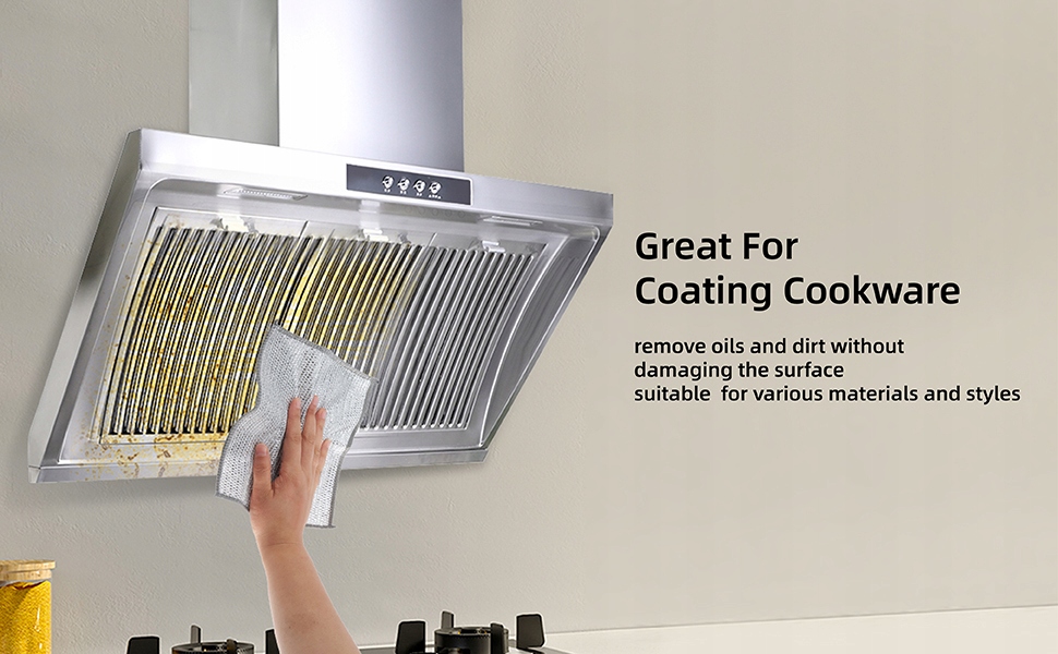 - Міцна нейлонова дротяна поверхня, бавовняні волокна з нержавіючої сталі та інші миючі властивості дозволяють швидко видалити різноманітні стійкі плями