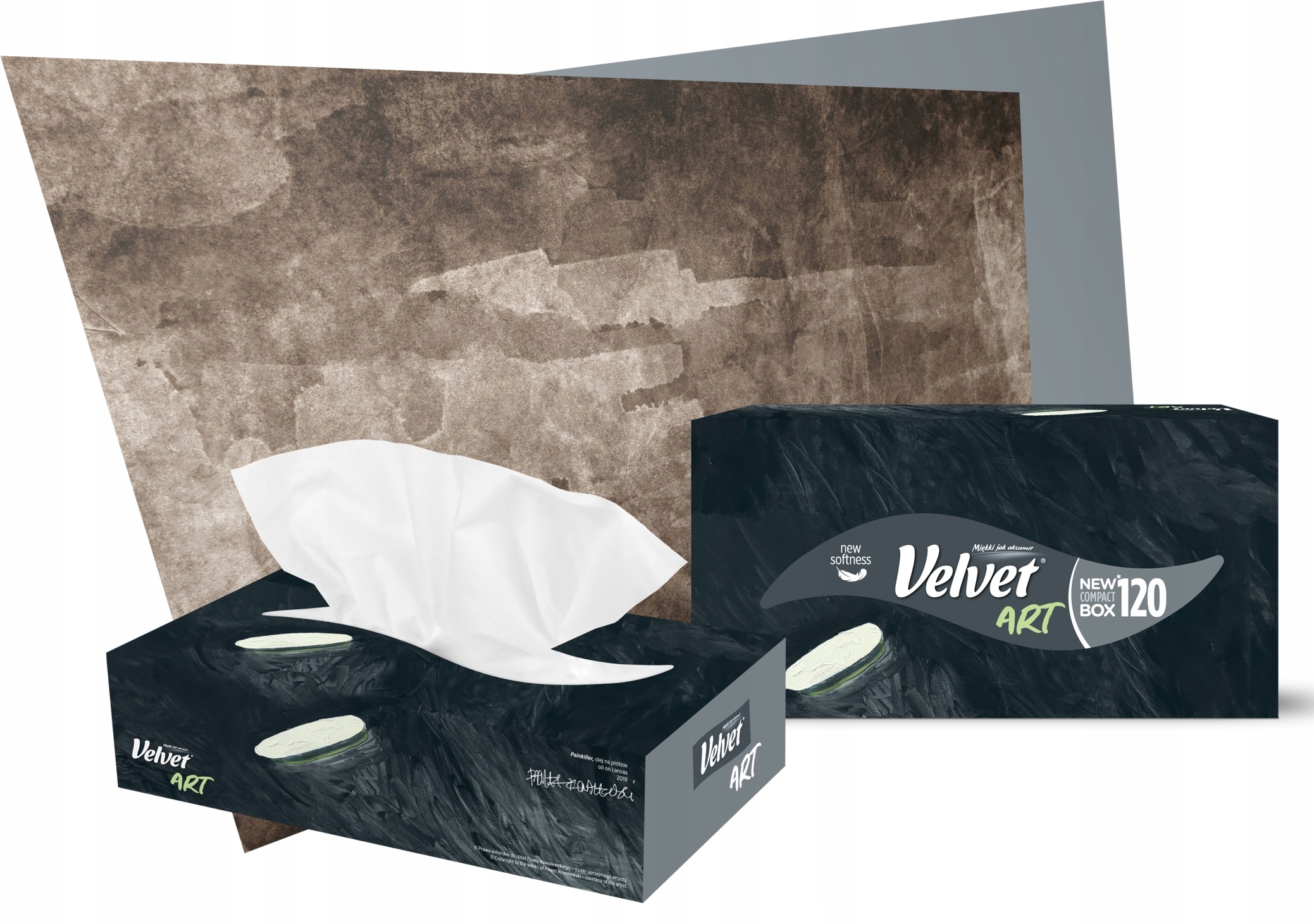 Нова лінія серветок Velvet Art була створена у співпраці з видатним польським художником ПавломКовалевським і представляє унікальні роботи з його мистецького доробку. Кожна скринька — це «маленький витвір мистецтва» з тисячами значень та асоціацій, різних для кожного одержувача. Мазки пензля, яскраві кольори та привабливі графічні мотиви стимулюють уяву, заохочують до роздумів і активізують мистецьку чутливість, притаманну кожному з нас!