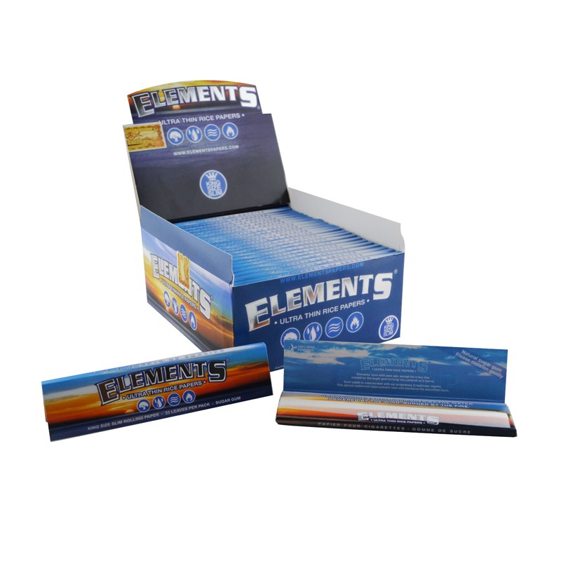 Ультратонкий папір для скручування рисового паперу ELEMENTS KING SIZE, навіть горить. Завдяки запатентованому рішенню CRISS CROSS ACCACIA GUM LINE рулонний папір завжди горить рівномірно. Версія King Size - ширша за стандартну тонку версію