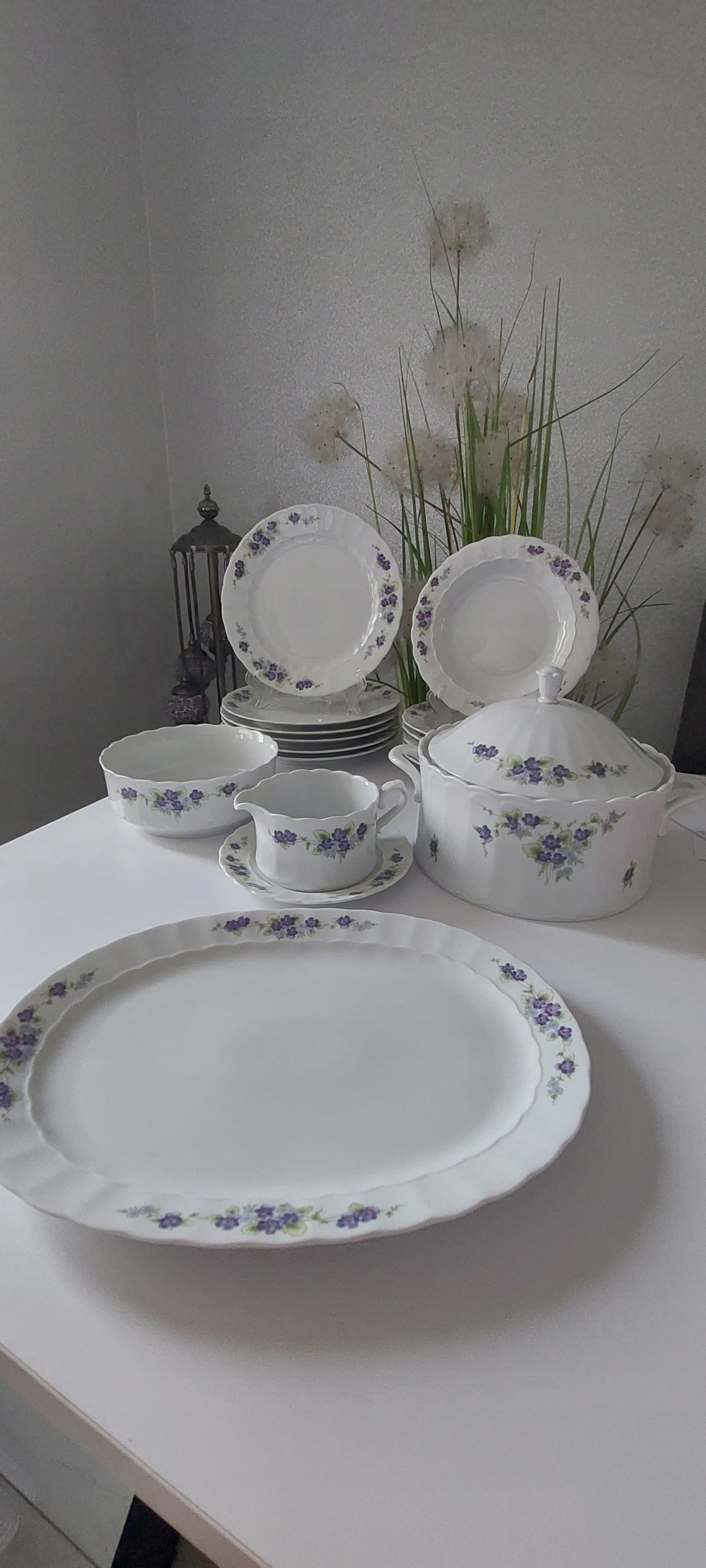 Набір сервірувальний на шість персон, в дуже хорошому стані, з мінусом, так як пошкоджена кришка вази (приклеєна ручка), в набір входить ваза ємністю 2000 мл, блюдо розмірами довжина 33 см. , ширина 23,5 см, соусник ємністю 300 мл, висота чаші 7 см, діаметр 18 см, шість неглибоких тарілок діаметром 24 см, шість глибоких тарілок діаметром 21,5 см.