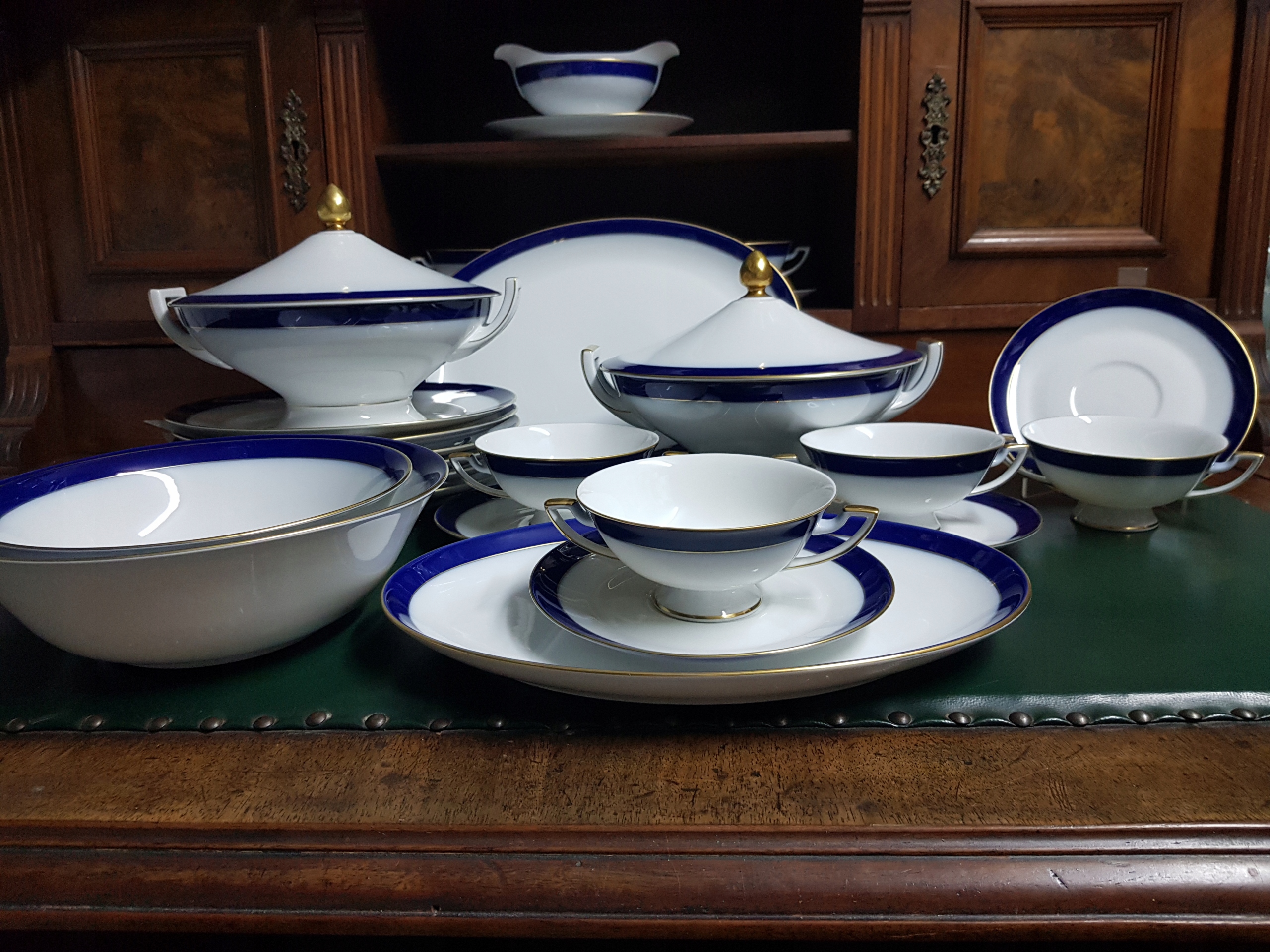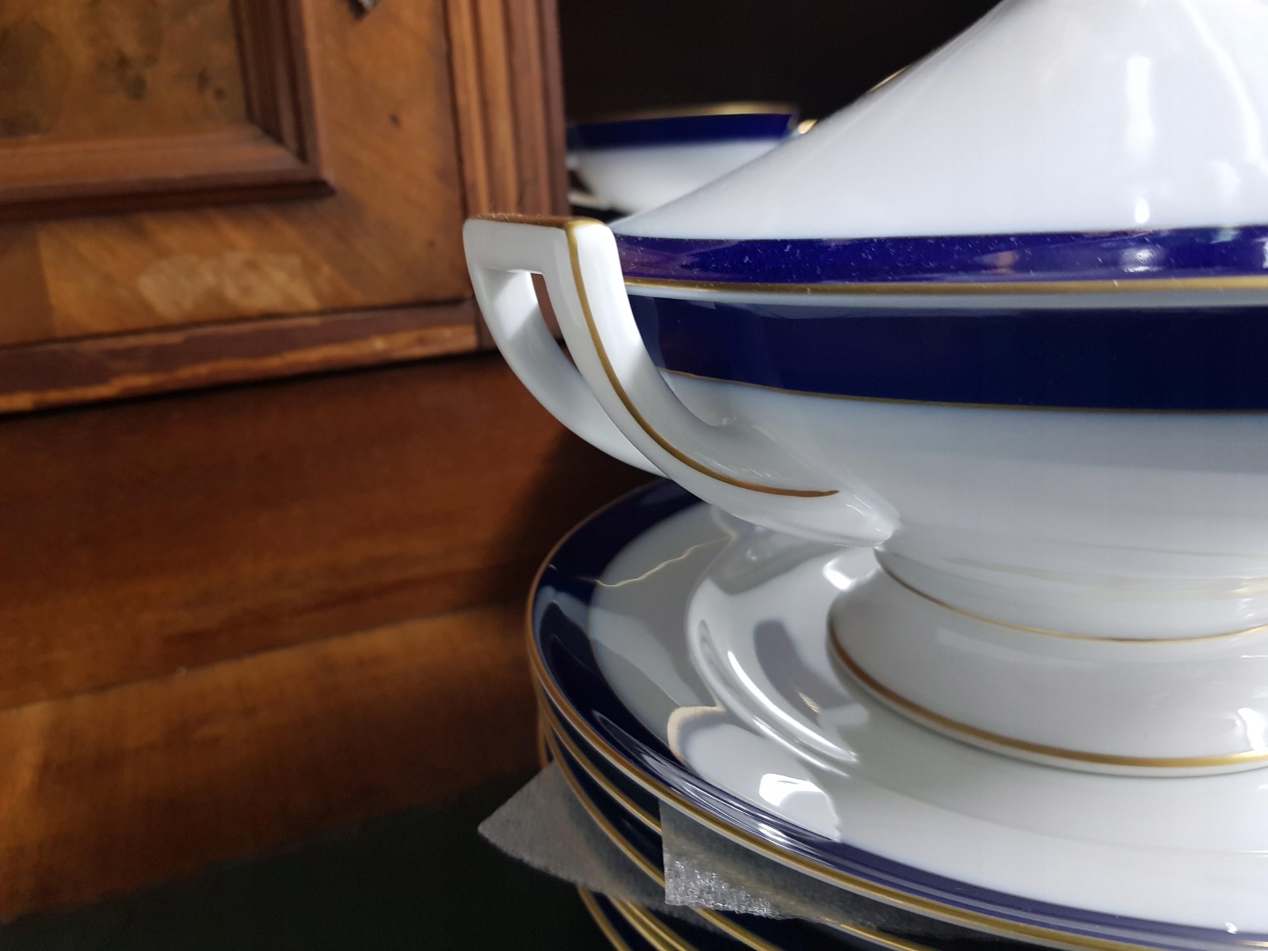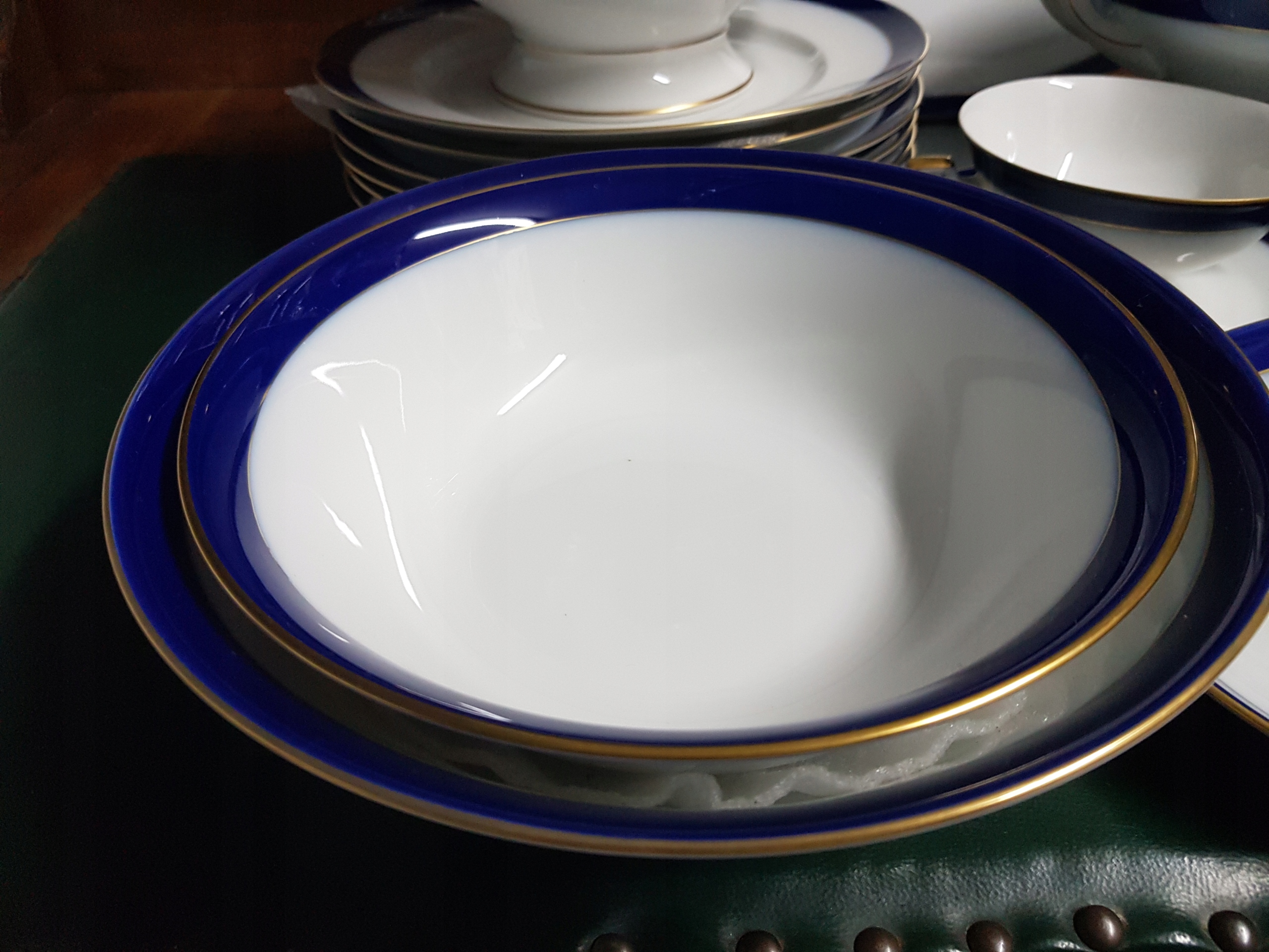 Біла порцеляна з кобальтовим фоновим акцентом. Золота смужка на край Позолочені ручки вази та каструлі.