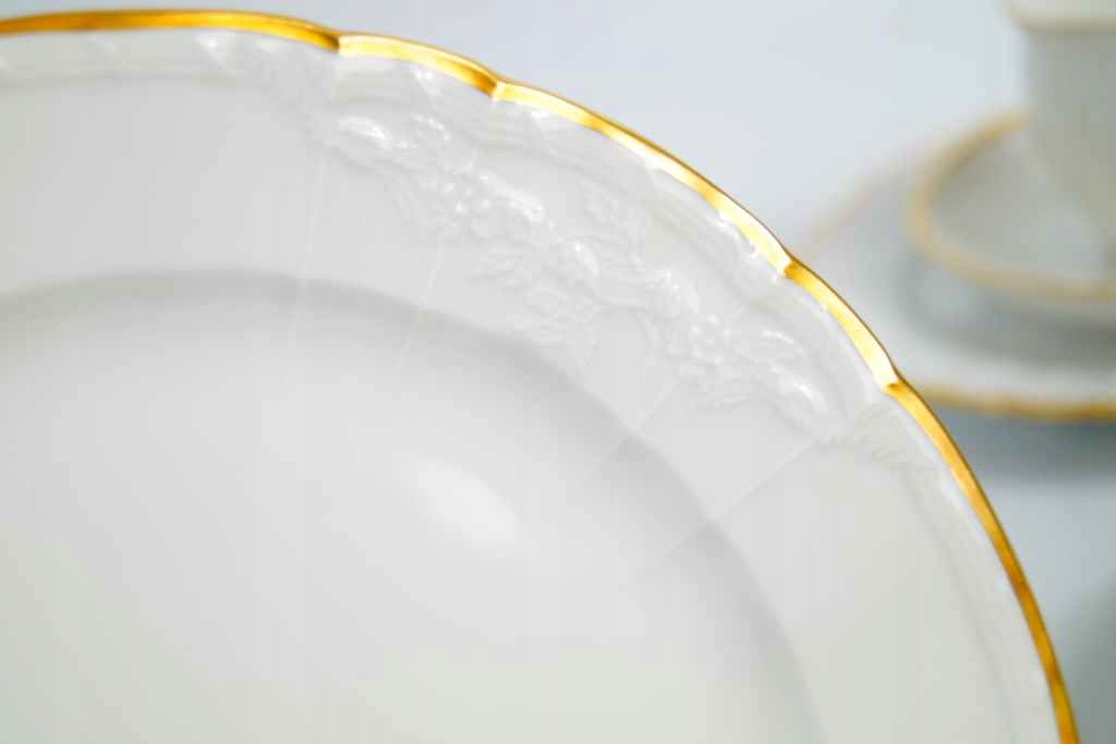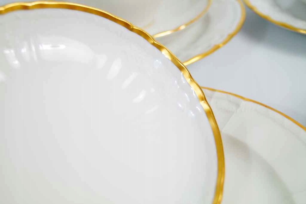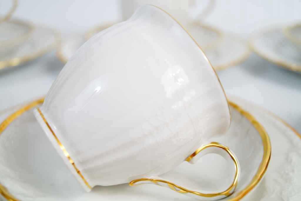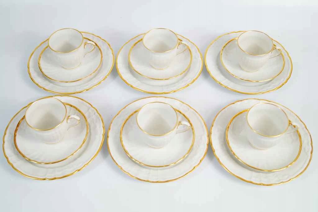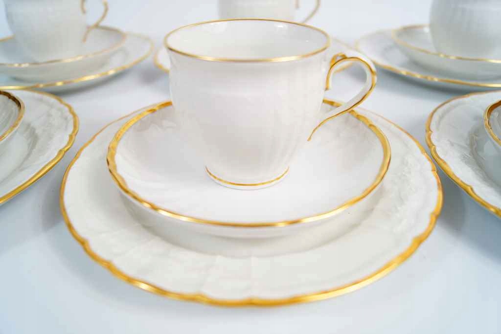 Пропоную набір із 6 наборів для сніданку білого кольору, прикрашених позолотою та рельєфами, типовими для серії KPM Berlin Rocaille.