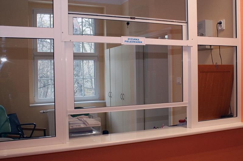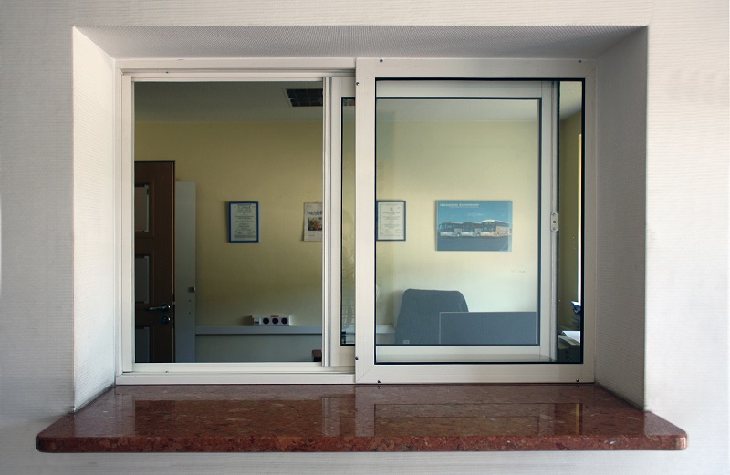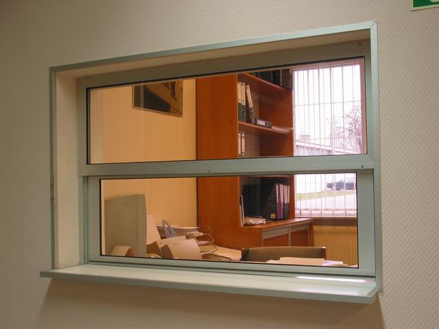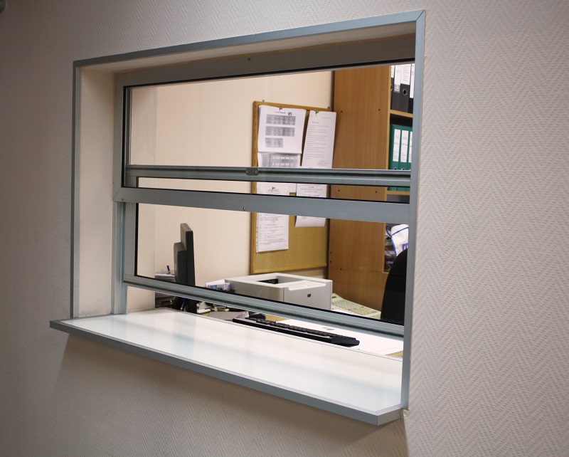 Сервісно-касові вікна з алюмінієвого профілю зі склом VSG 33.1 (6,4 мм). Вікно розсувається вертикально.