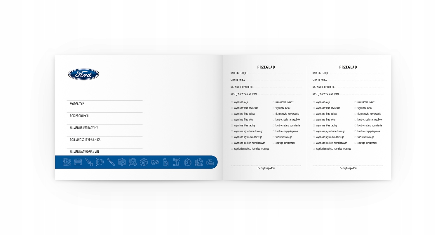 Сервісна книжка для автомобілів FORD. Він містить усі типові та важливі розділи, а саме: інформацію про транспортний засіб, проведені перевірки та ремонти, а також місце для додаткових приміток. Набір також збагачений двома примірниками купівлі-продажу автомобіля договір, та акт про дорогу події.