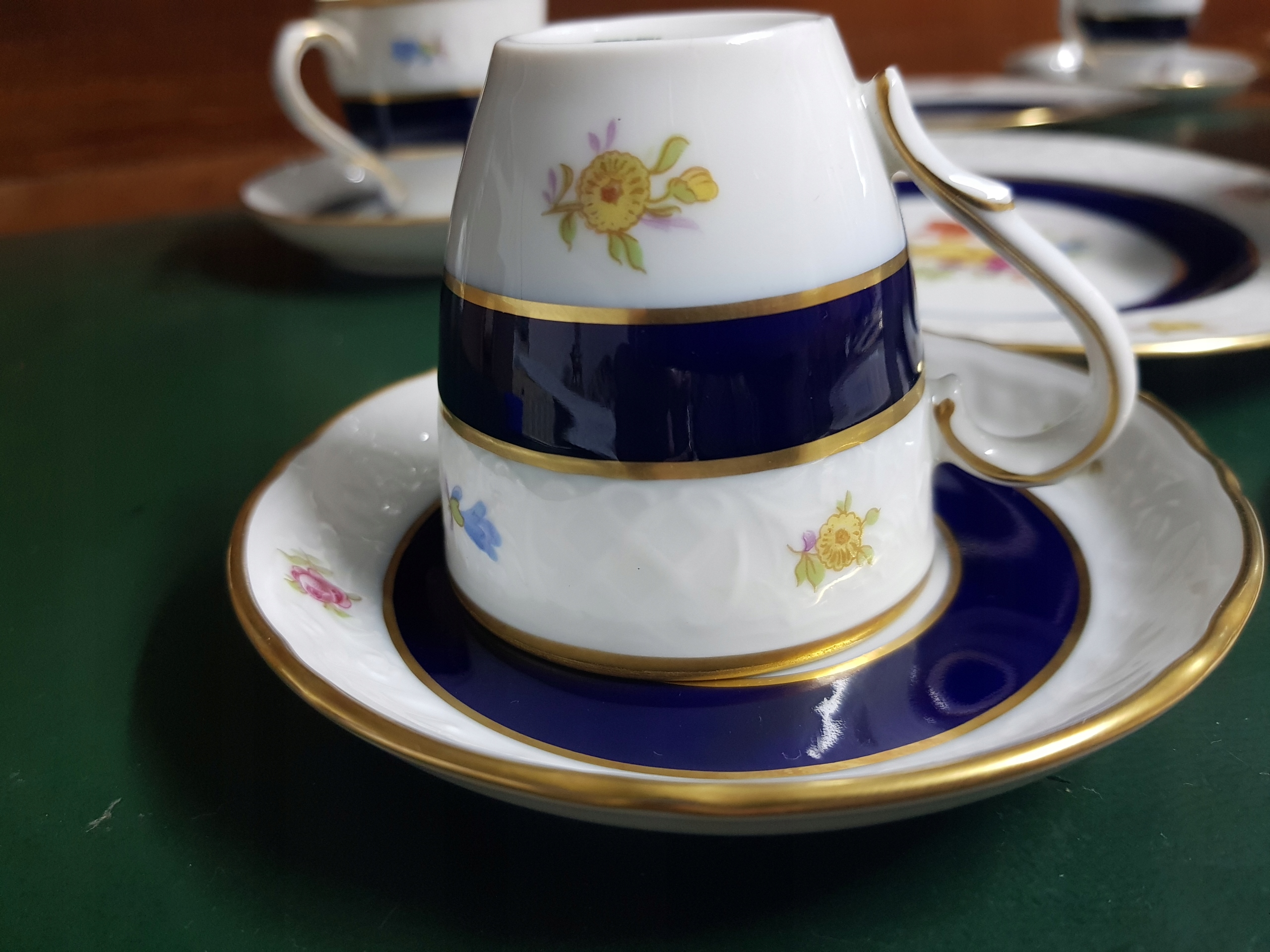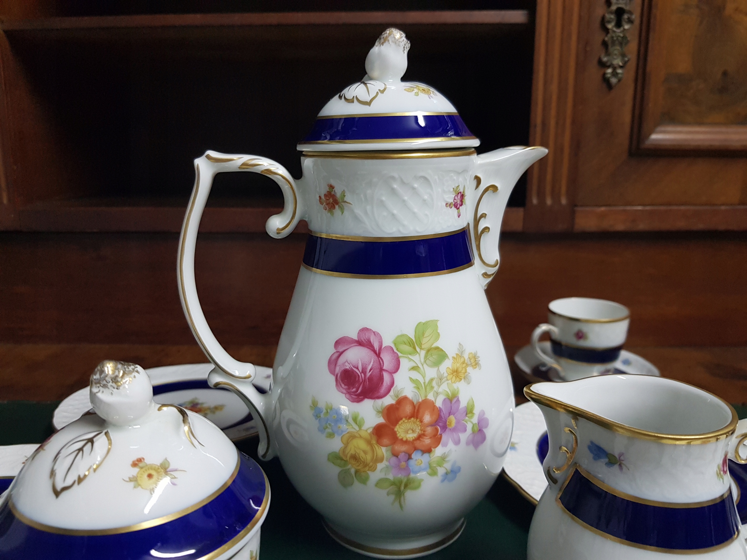 Предметом аукціону є сервіз мокко Schumann. Набір прикрашений кобальтово-блакитною смужкою та квітковими мотивами.