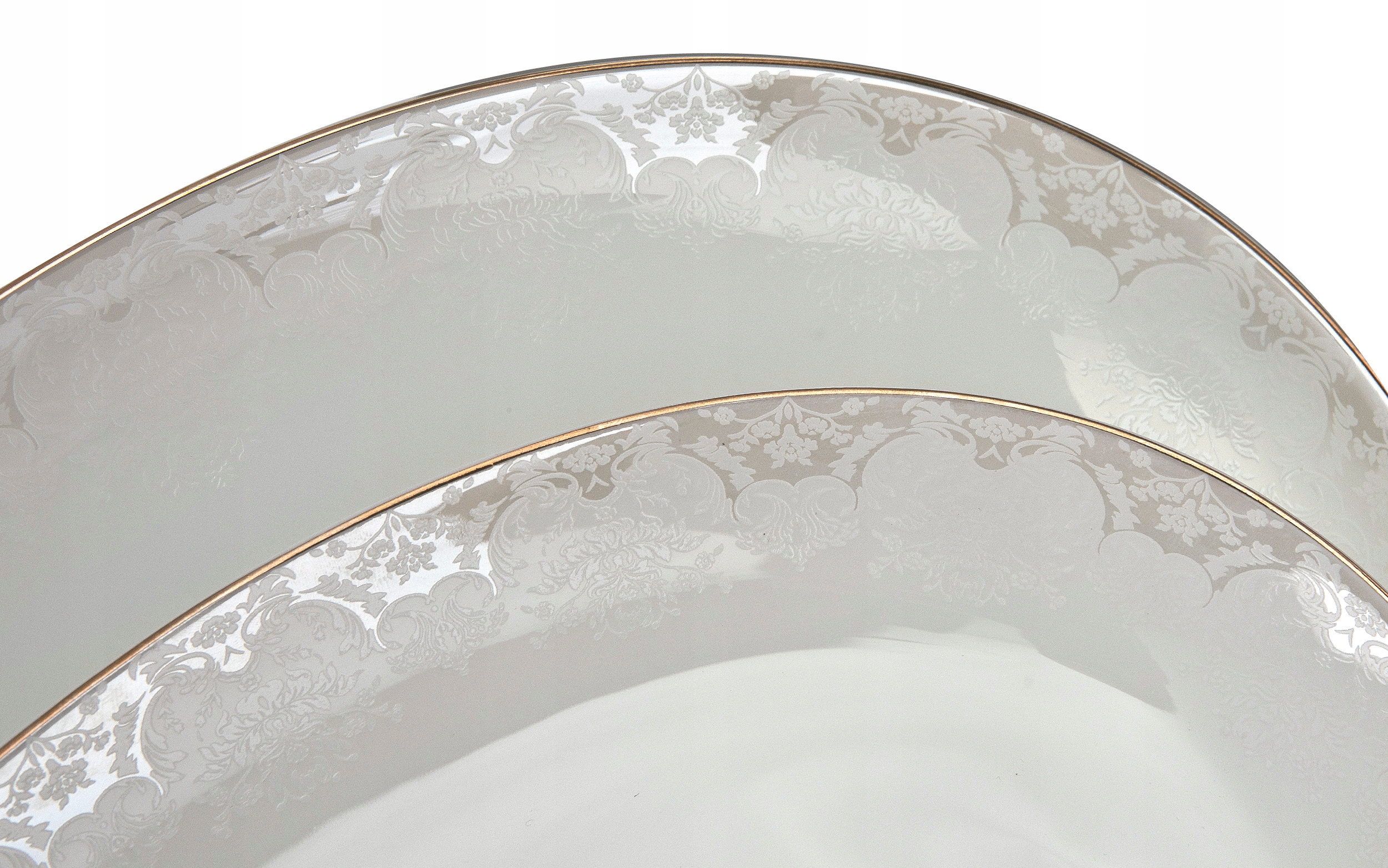 Сервіз має тонкий дизайн у вигляді ніжної аплікації. відчуваються на дотик, а також золоті смужки, які обертаються навколо країв посуду.