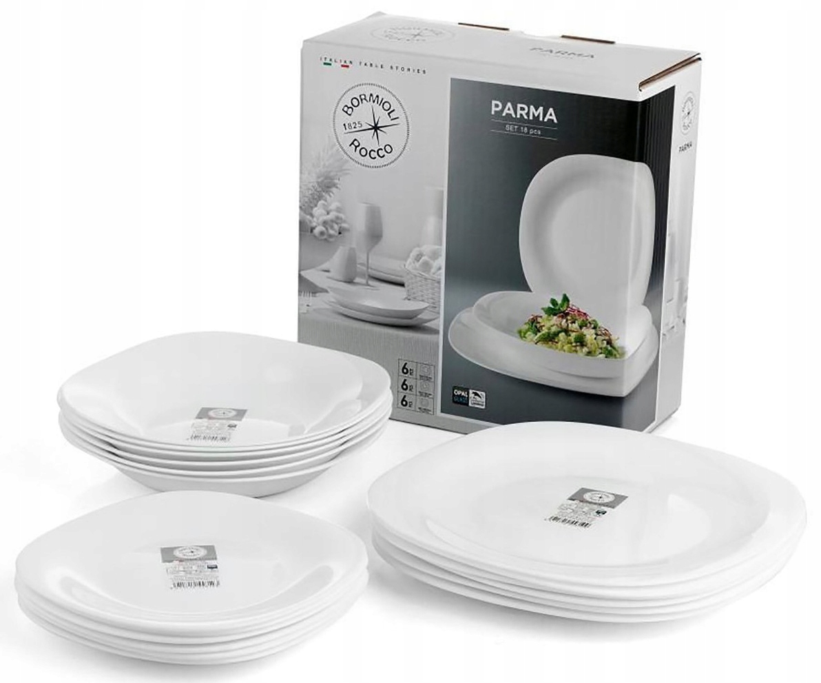 Сервіз Parma від італійського бренду Bormioli Rocco - це поєднання сучасного, елегантного стилю та функціональності. Ідеально підходить для щоденного використання як постійний елемент столового посуду. Білосніжні тарілки можуть стати цікавим контрастом до інтер'єру їдальні, а також допоможуть продемонструвати готові страви. Простий малюнок дозволяє підібрати універсальні аксесуари білого або чорного кольору для створення контрасту. Висока якість обробки та найкращі матеріали, які використовуються для виготовлення сервізу є його найбільшою перевагою.
