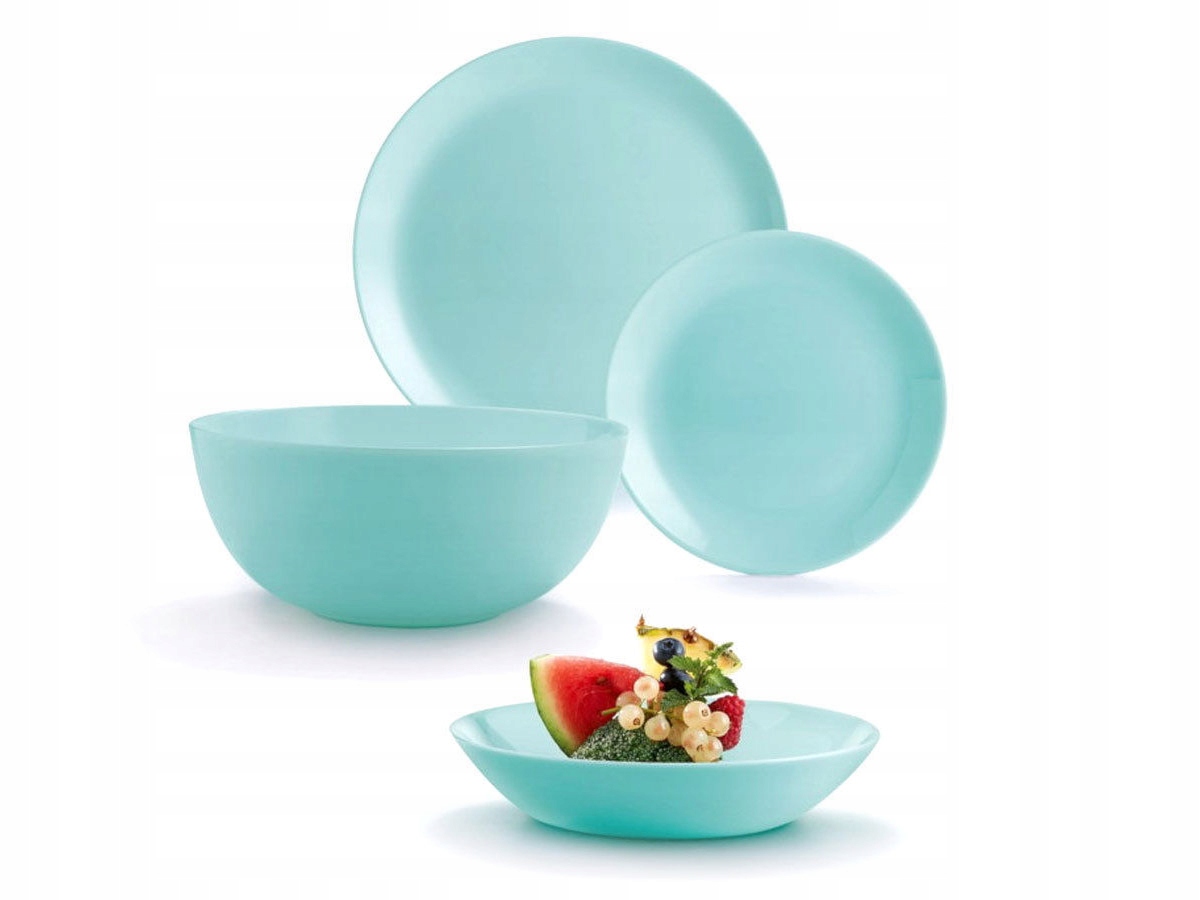 Обід Дівалі Luminarc. Сервіз обідній на 6 осіб, 19 елементів. Гладкий посуд із загартованого скла бірюзового кольору - легкий і міцний. Набір посуду, на якому можна подавати різні страви: другі страви, супи, десерти, салати.
