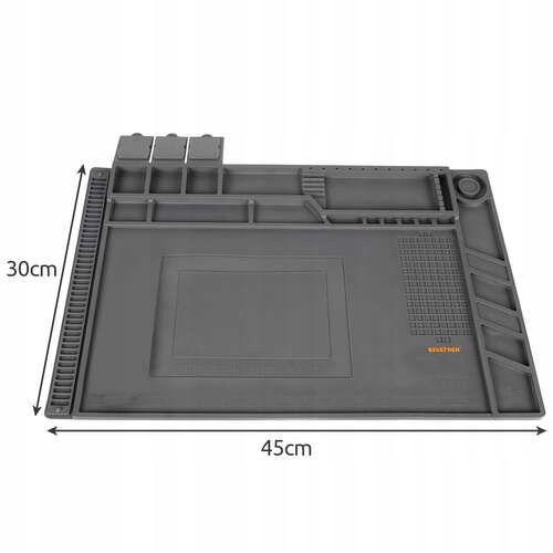 Багатофункціональний силіконовий сервіжний килимок є обов’язковим для кожного аматора та професійного ентузіаста DIY. Це значно полегшує будь-який ремонт електроніки та паяння. Стійкий до високої температури (до 500 градусів Цельсія) і деформації. Має 4 магнітні точки: для намагнічування викруток, для деталей і гвинтів, а також численні відділення та лінійну шкалу в сантиметрах і дюймах.