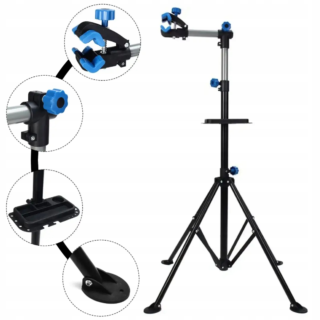 Велосервіс дає користувачеві неймовірний комфорт при ремонті велосипеда. Складні ніжки роблять стійку велосипеда стійкою і не перекинуться. Крім того, в ніжках підставки є отвори, які дозволяють прикріпити сервісну ручку до землі. Регульований металевий підсідельний штир до 190 см дозволяє розмістити велосипед на оптимальній висоті, щоб вам не довелося нахилятися. У комплект також входить телескопічний кронштейн для кріплення керма при ремонті переднього колеса.
