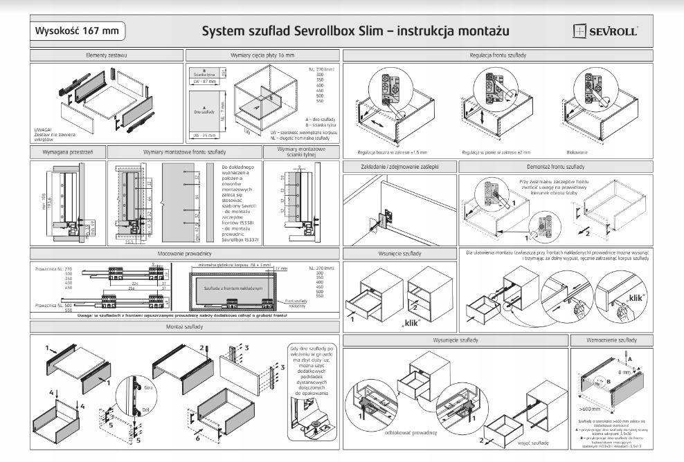 SevrollBox Slim - система для ящиків. Його зовнішній вигляд і дозволяє створити сучасний ящик. Боковини ящиків з 4 висотами: 84 мм, 116 мм, 167 мм, 199 мм мають ідеальну прямокутну форму, а значить, займають менше місця всередині ящика. Напрямні з тихим закриванням забезпечують комфорт використання, а повне висування забезпечує необмежений доступ до ящика.