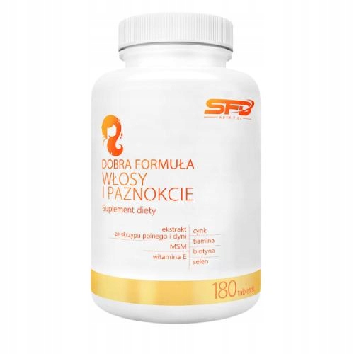SFD GOOD FORMULA HAIR AND NAILS — це добавка у формі таблеток, що містить спеціально приготовлений рецепт для підтримки здоров’я та краси волосся і нігті. Формула, крім додаткової дози біотину, містить вітаміни та мінерали. Завдяки вмісту хвоща та екстракту гарбуза добавка легко підтримає ріст волосся, захистить нігті та зміцнить їх структуру.