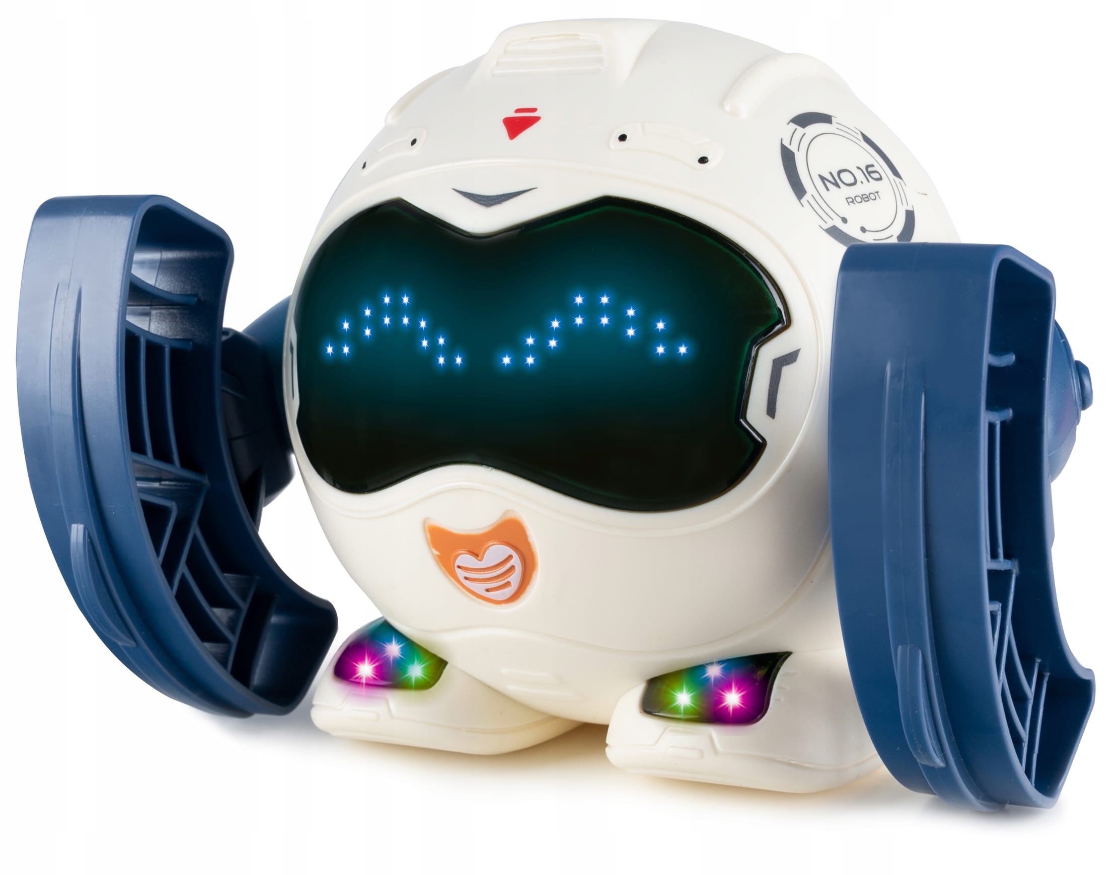Робот рухає своїми руками, обертається на 360° і котиться. Вогники на його ніжках світяться різними кольорами.