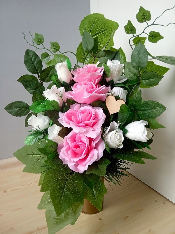 - ширина - 40 см. Букет із штучних квітів і квіткових аксесуарів. Все поміщається в подовжений пластиковий горщик, залитий цементом. Завдяки цьому вся композиція стійка.
