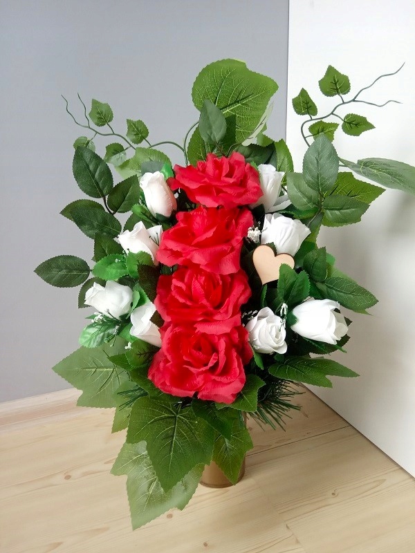 Букет-ваза складається зі штучних квітів (білі та червоні троянди), листя та флористичних аксесуарів. Все поміщається в подовжений пластиковий горщик, залитий цементом. Завдяки цьому вся композиція є стійкою.