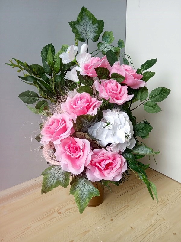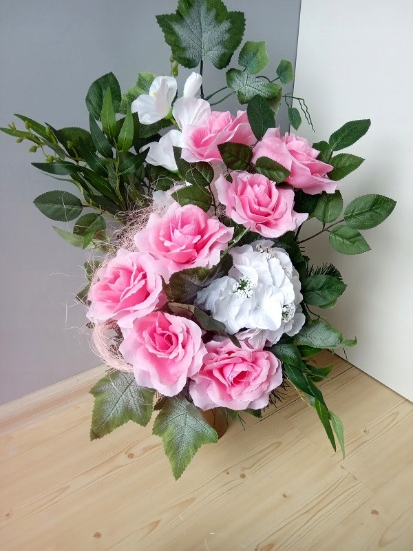 - ширина - 35 см. Букет із штучних квітів і квіткових аксесуарів. Все поміщається в подовжений пластиковий горщик, залитий цементом. Завдяки цьому вся композиція стійка.