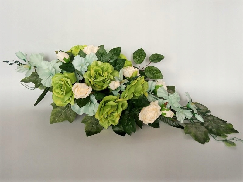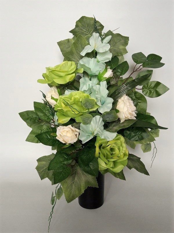 Букет-ваза складається зі штучних квітів, листя та флористичних аксесуарів. Все поміщається в подовжений пластиковий горщик, залитий цементом. Завдяки цьому вся композиція стабільна.