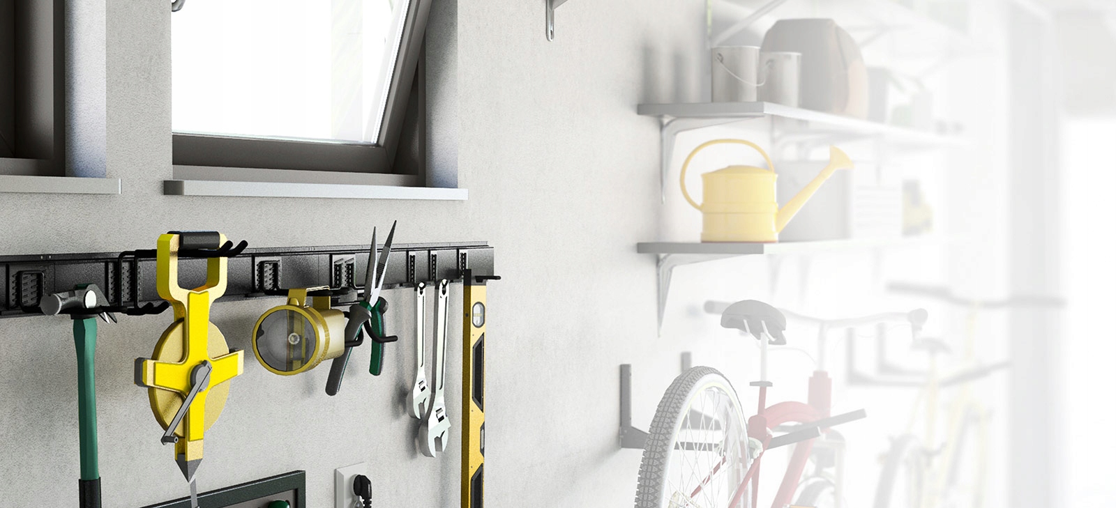 Завдяки Golijat гачки, лопати, садові шланги, кабелі та електроінструменти знайдуть місце в кожному гаражі, майстерні чи підвалі. Гаки зроблені зі сталі, а елементи, які безпосередньо контактують з підвішеними предметами, покриті гумовим покриттям, яке захищає від подряпин.