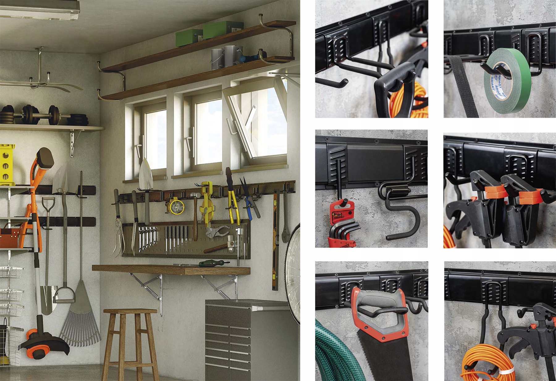 Завдяки Golijat гаки, лопати, садові шланги, кабелі та електроінструменти знайдуть місце в кожному гаражі, майстерні чи підвалі. Гаки зроблені зі сталі, а елементи, які безпосередньо контактують з підвішеними предметами, покриті гумовим покриттям, яке захищає від подряпин.