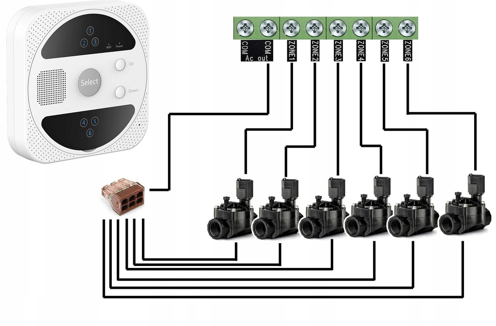 Один дріт від кожного електромагнітного клапана (незалежно від якого) - з’єднати разом (для цього можна використовувати, наприклад, електричні кубики). Під’єднайте під’єднані дроти до виходу контролера, позначеного COM.