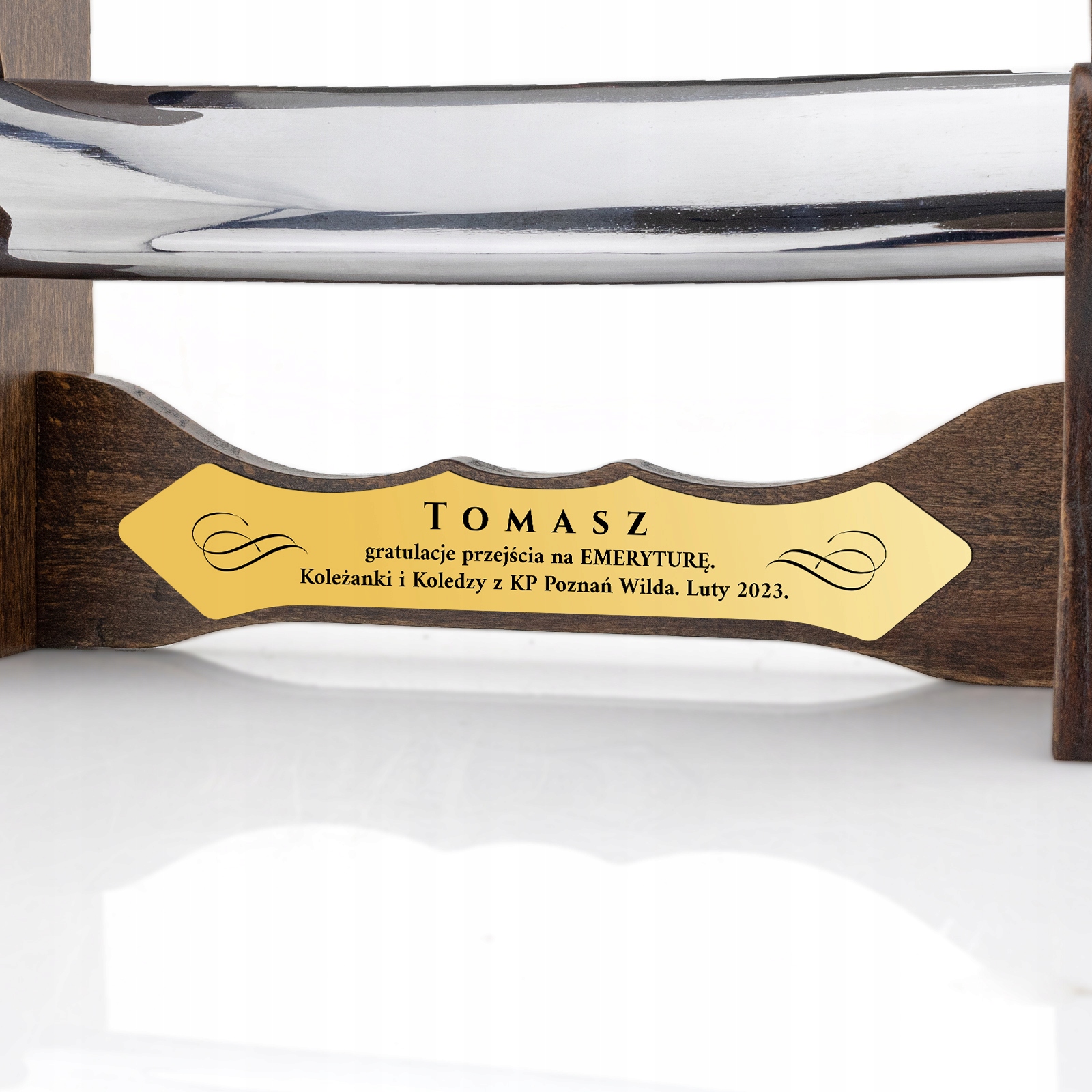 Вірнакопія польської офіцерської шаблі 1921 року. з піхвами на дерев'яній підставці. Це ідеальна ідея для подарунку з нагоди дня народження, іменин, ювілею або ієрейської хіротонії . Стіл повністю дерев'яний, з місцем для шаблі та піхов. Рукоятка шаблі повністю закрита, виготовлена з латуні та стилізована під голову орла. Голова виготовлена з високоякісної толедської сталі, прикрашена красивим орнаментом, зображенням орла з короною та гаслом «Боже, шануй батьківщину». Рифлена ручка зі скрученими латунними дротами. Шабля не заточена і для цього не призначена. Разом з індивідуальним гравіюванням стане гарною та оригінальною прикрасою будь-якого інтер'єру!