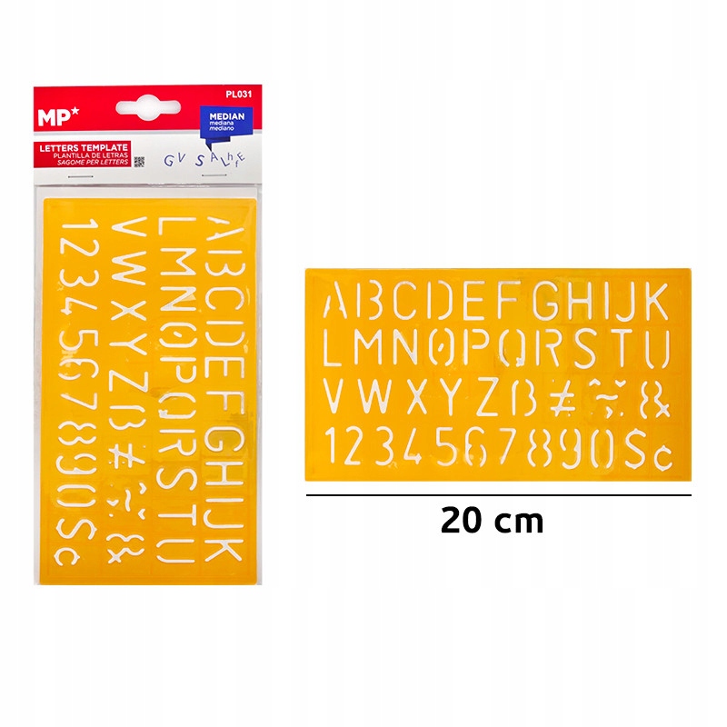 пластиковий шаблон з отворами у формі літер і цифр. Виготовлений з прозорого помаранчевого пластику. Шаблон містить алфавіт друкованих та письмових листів та цифр. Легка лінія буде використовуватися як в студії дизайну, так і в технічному малюнку та художньому просторі. Дірки в шаблоні висотою близько 20 мм. Довжина правителя - 20 см.
