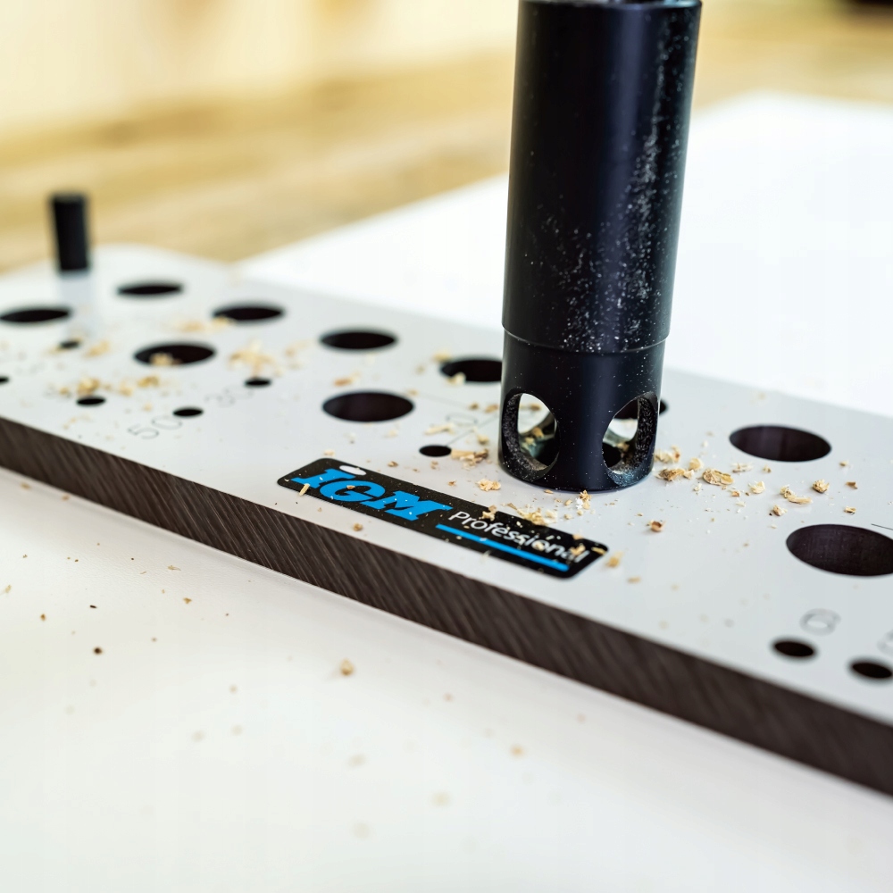 Працювати з шаблоном дуже просто. Встановіть відповідну глибину свердління на свердлильному шпинделі та прикріпіть його до дрилі. Потім помістіть пристрій на дошку, упріть його в упори і зафіксуйте затискачами або міцно тримайте іншою рукою. Використовуючи свердло для дюбелів із направляючим наконечником і насічками, ви можете легко й точно створити отвір без задирок на краю.