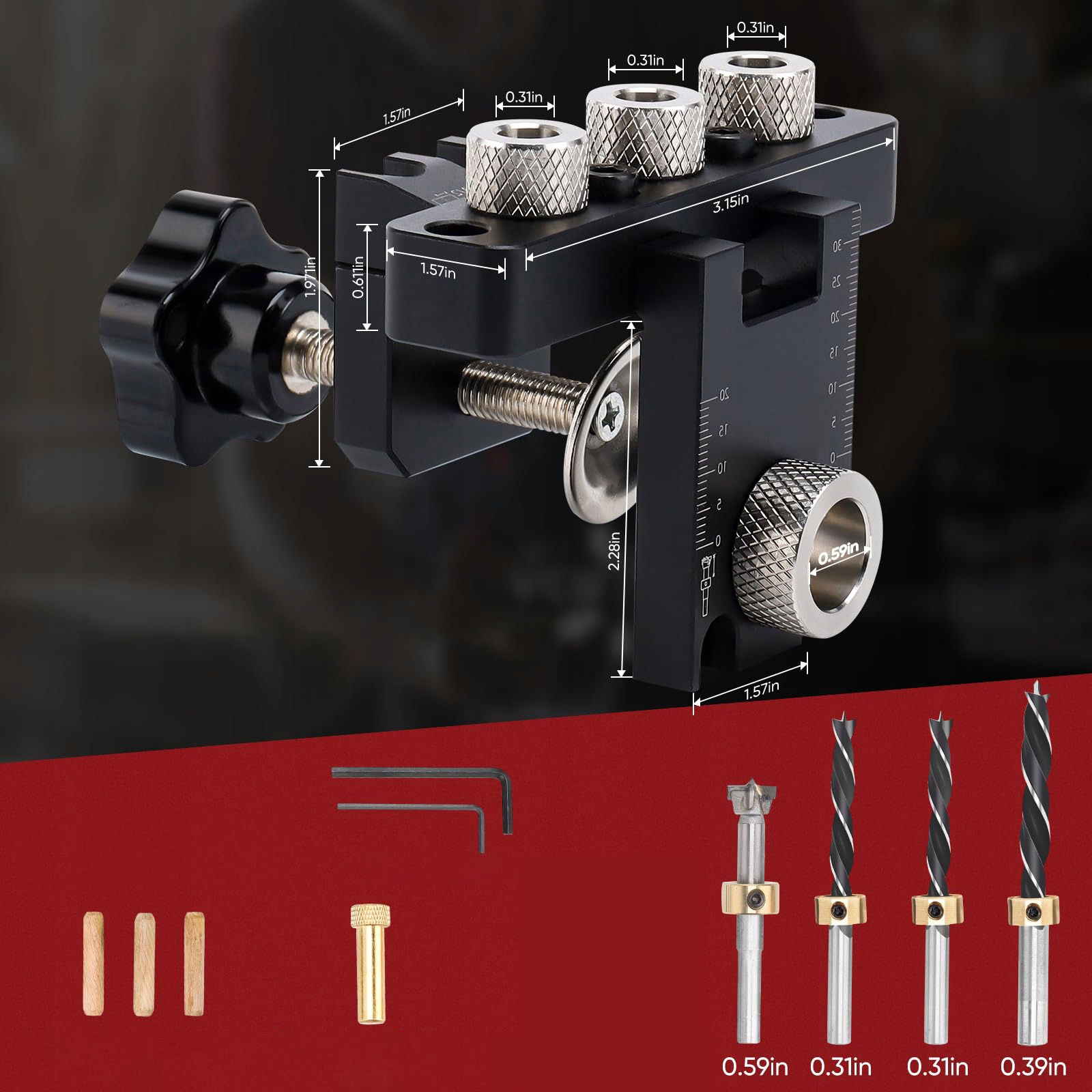 【Повний набір】Регульований шаблон для дюбелів включає шаблон для отворів 3-в-1, латунний упор, три свердла (8 мм x 2, 10 мм x 1, 15 мм x 1), три дерев’яні дюбелі та два шестигранні ключі.